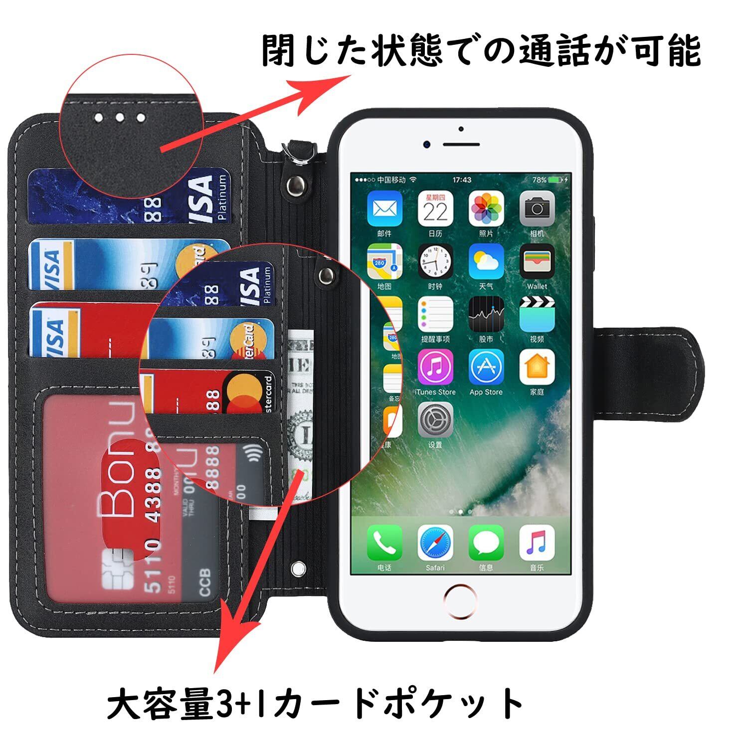 【収納機能】ケース内側に実用性のカード入れポケット×3、内側ポケット×1。また、消磁を防ぐために、カードスロットにあまり多くのカードを入れないことをお勧めします。携帯電話ケースのアップグレードでは、側面にストラップが追加され、脱落することなく手に掛けることができます。カードスロットに2枚のカードを入れると、内蔵マグネットの機能を最大限に発揮し、カードが消磁されるのを防ぐことができます。