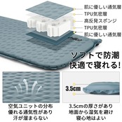【よい寝心地】テントマットとして、快適な寝心地は一番大切です。こちらのキャンプマットは多層の素材があり、中には高反発なスポンジがあり、3.5cmの厚さに加え、横になったときにつっぱりません。この厚も地面から湿気を避け、より安心して使えます。さらに、車中泊マットの表面には空気ユニットの分布があり、肌に優しい通気層もあり、通気性に汗が溜まらないです。マットは高いクッション性を持ち、厚み3.5cmで車の段差や地面の凹凸を解消し、凹凸感を感じにくいので快適な睡眠を確保します。インフレーターマットは敷布団やベッドの役割を果たしてくれます。スリーピングバッグの下に敷くことで、地面の凸凹に影響を受けにくく、快適に眠ることができます。防潮の特性もありますので、アウトドアに使う時に、清潔を保ちます。