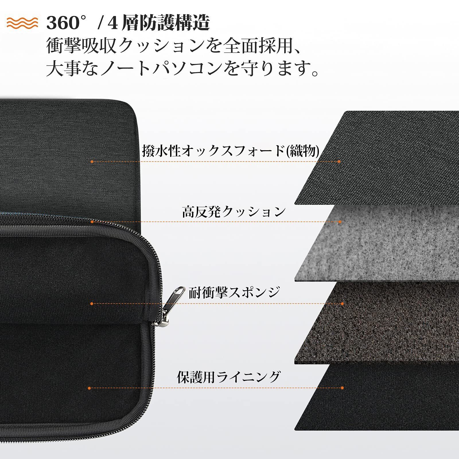 「360° 超強保護」衝撃を吸収するゴム製品を底部に内蔵して、4層防護構造「①撥水性オックスフォード(織物)、②高反発クッション、③耐衝撃スポンジ、④保護用ライニング」を全面採用します。その上、パソコンの表面にキズを防止するために、内側はすべて起毛素材を利用して、パソコンを360°全面保護します。