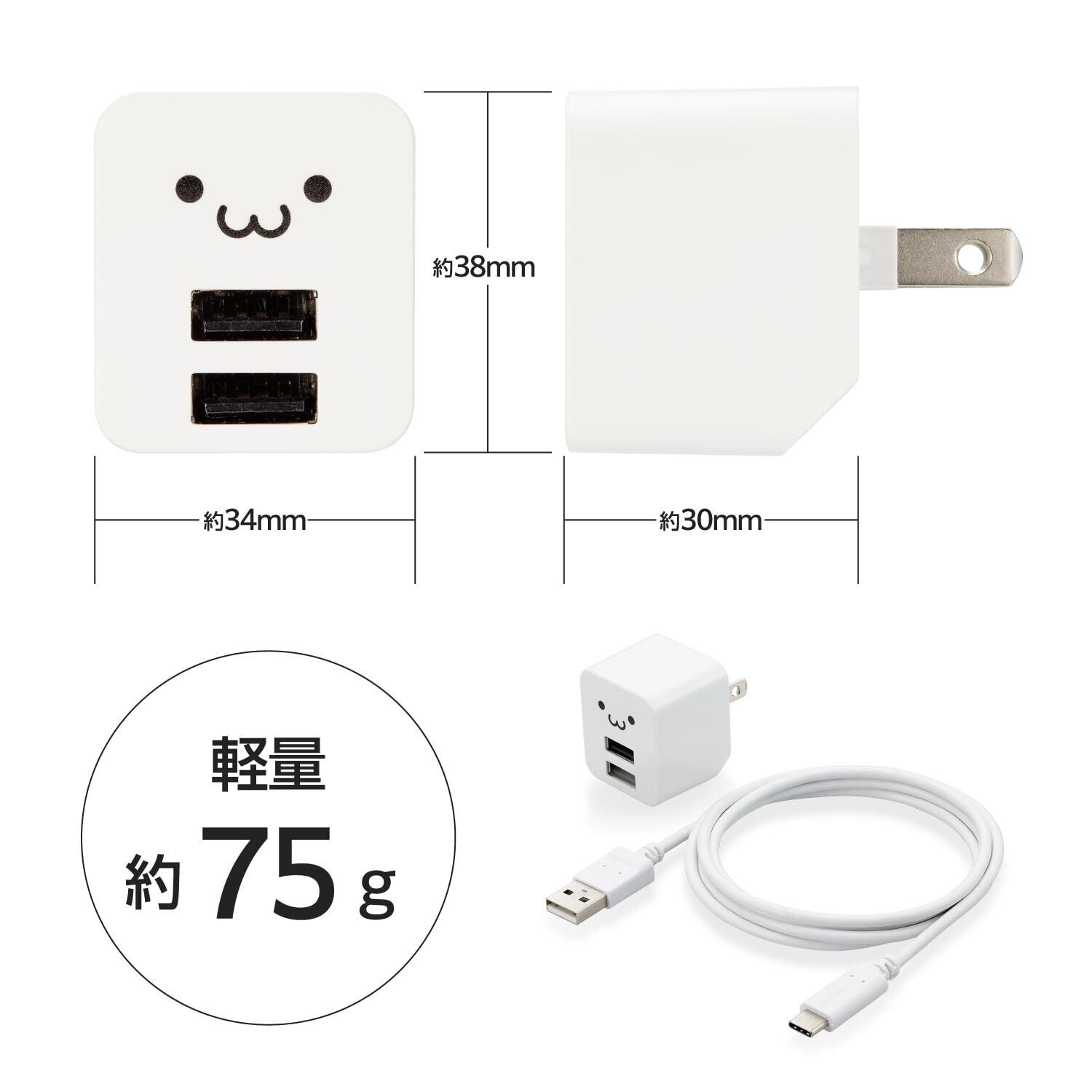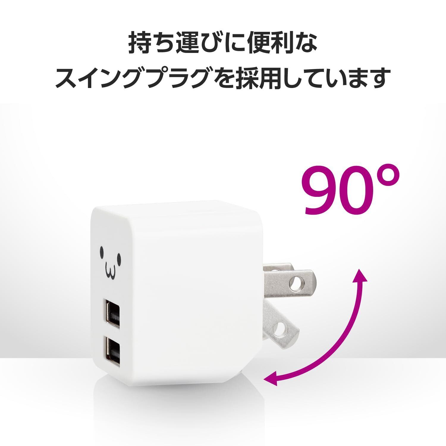 エレコム 充電器 Type-C USB コンセント 2ポート USB-A×2 12W 5V/2.4A ケーブル付属 1.2m しろちゃん MPA-ACCX01WF