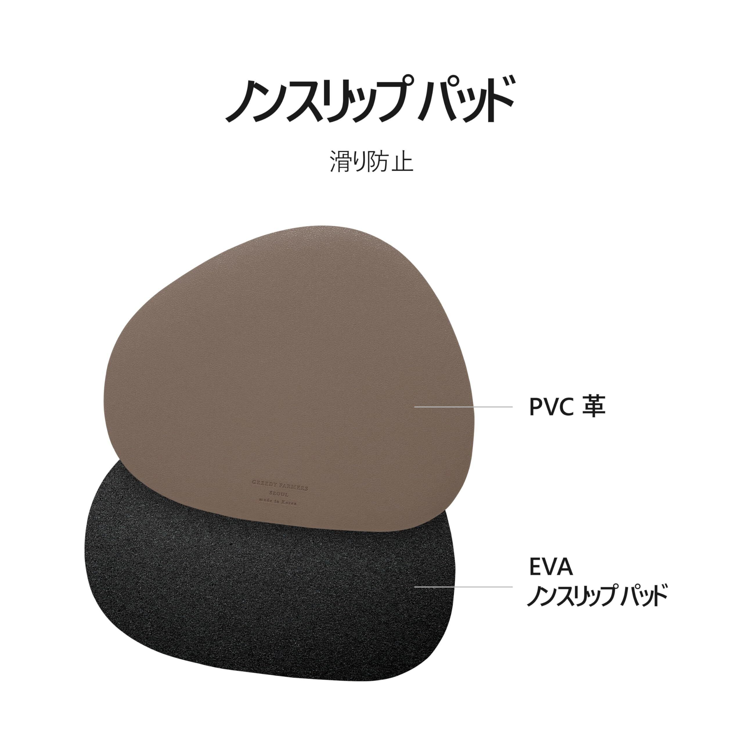 【滑り防止ノンスリップパッド】 マウスパッドの裏面に耐熱性の優れた高級ノンスリップパッドを付着しました。 机から簡単に押されたり滑ったりせず、不便なく安定感持って使用できます。 前面は雰囲気のある革の生地、裏面は実用性の高いノンスリップパッドを使用して デザインと実用性両部分を全て満たす製品です。