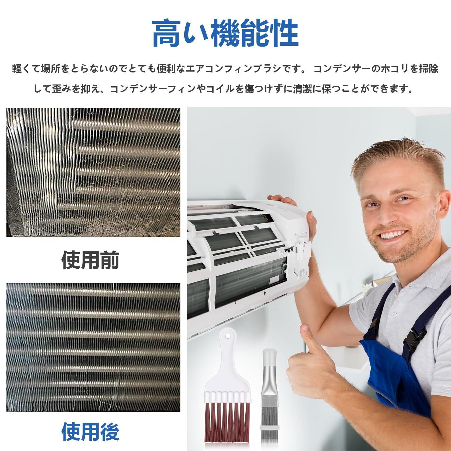 【製品用途】軽量で場所を取らないので、使い方がとても簡単で省力的です。 コンデンサーに付着したホコリを掃除し、変形を抑え、コンデンサーフィンとコイルを傷つけずに清潔に保つことができます。