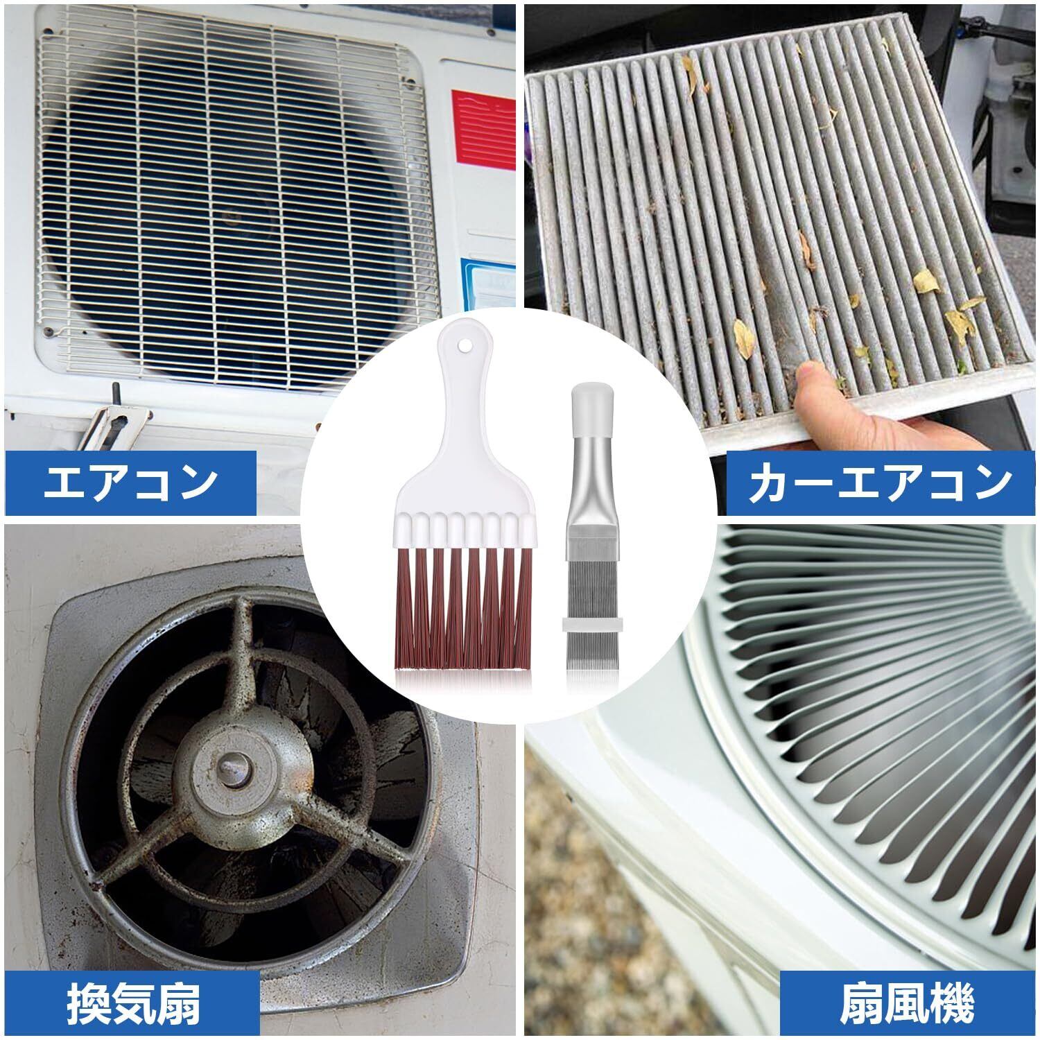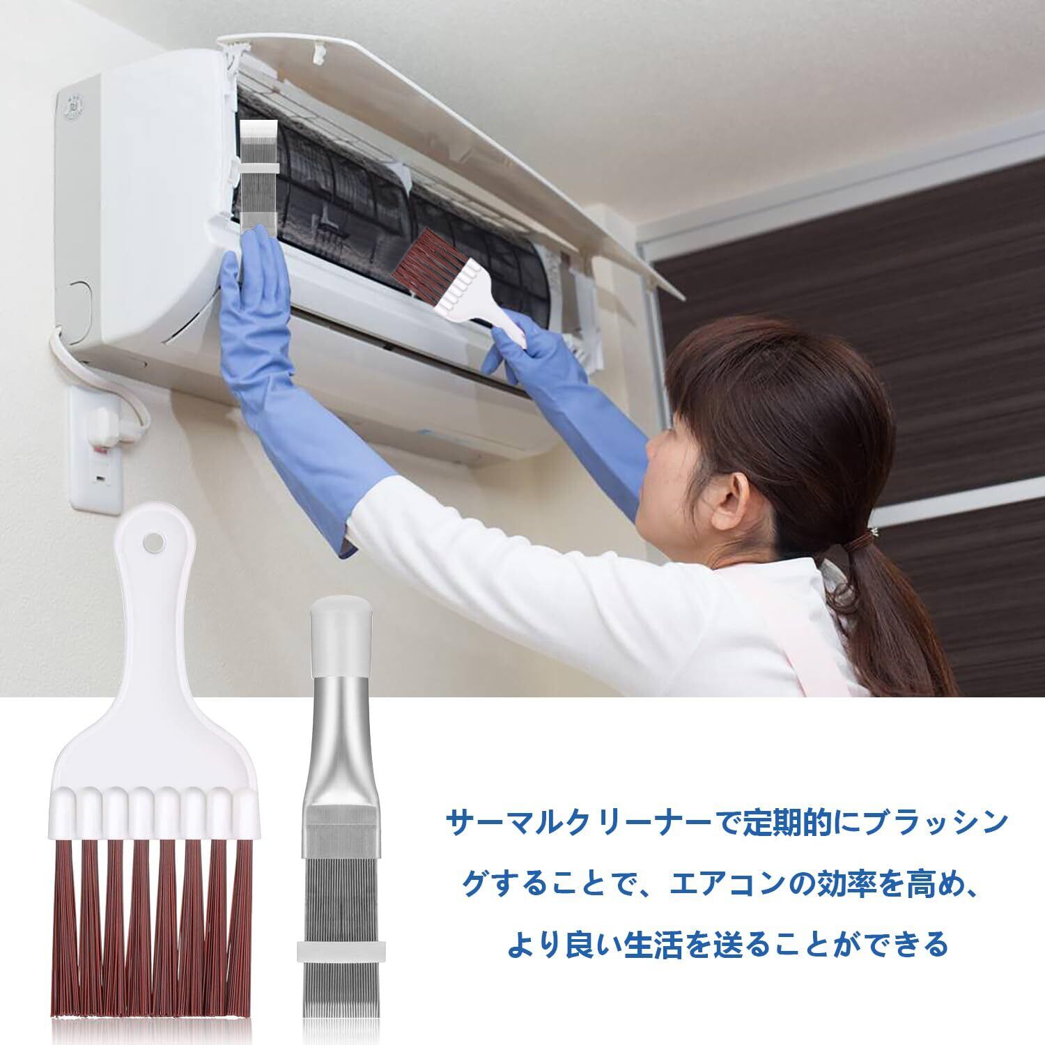 【セット内容】茶色い毛のブラシ+メタルフィンのクリーニングブラシを含むエアコンコンデンサーブラシセットです。 組み合わせて使用することで、エアコンのフィンの洗浄効率を高めることができます。