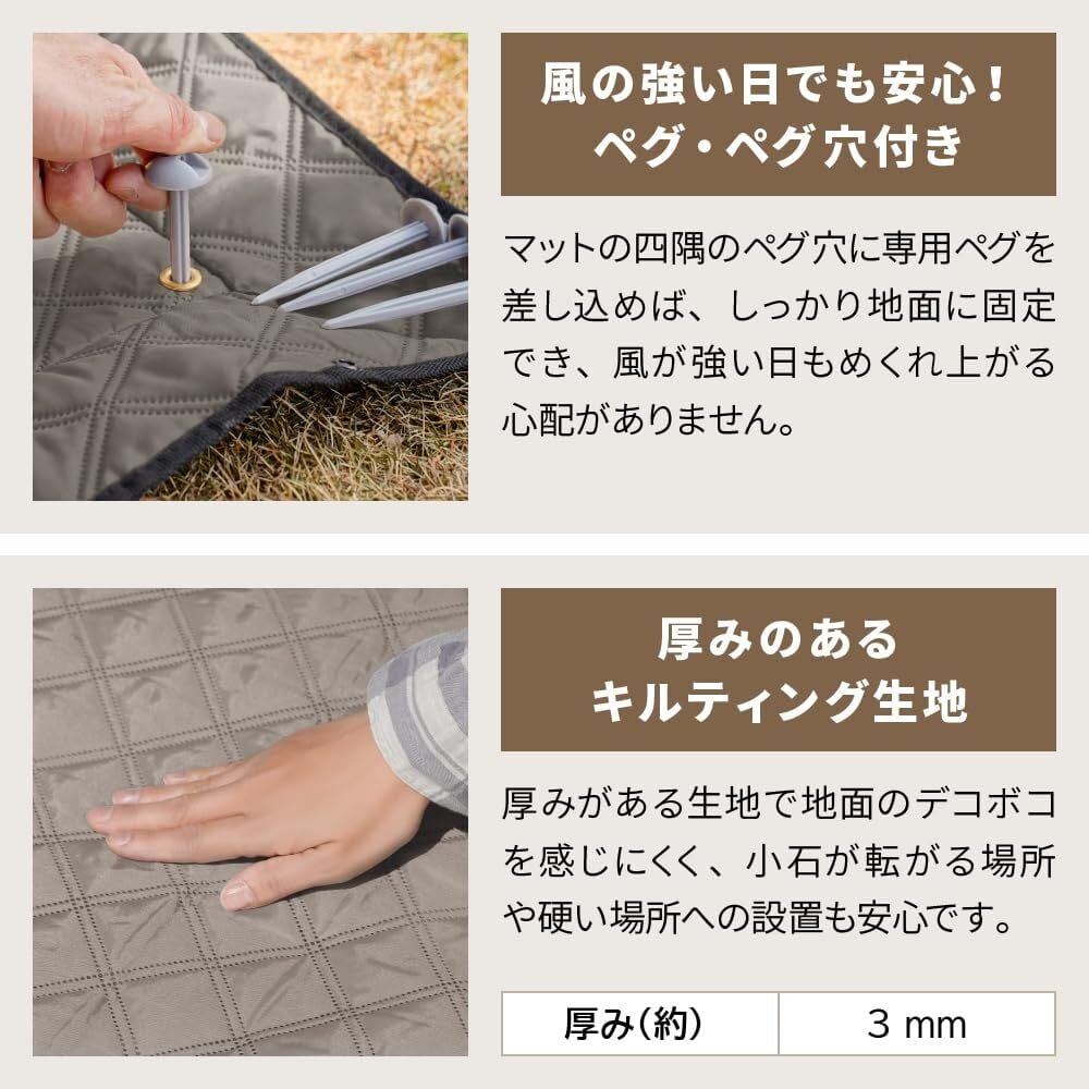 【厚みのあるキルティング生地】キルティング生地は約3mmの厚みがあり、厚手のため地面のデコボコを感じにくく、小石が転がる場所や硬い場所への設置も安心です。【撥水性がありお手入れ簡単】表生地・裏生地ともに撥水性があるので汚れに強く、飲みこぼしもサッと拭き取れます。また、汚れが気になるときは、ご家庭の洗濯機で簡単に洗えるため衛生的です。※生地には撥水加工を施しておりますが、経年や日々の使用により撥水性は徐々に低下します。※水温30℃以下でネット洗い、漂白剤・乾燥機・アイロン不可。