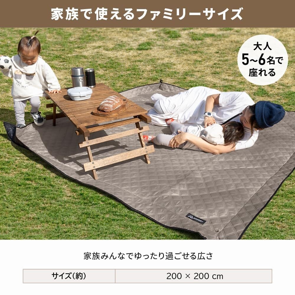 【家族で使えるファミリーサイズ】家族みんなでゆったり過ごせる、約200×200cmの大きめサイズ。大人5~6人が座れる大きさです。テント内のインナーマットとして、折りたたんでコットやアウトドアベッドのクッションとしてのご使用もおすすめです。