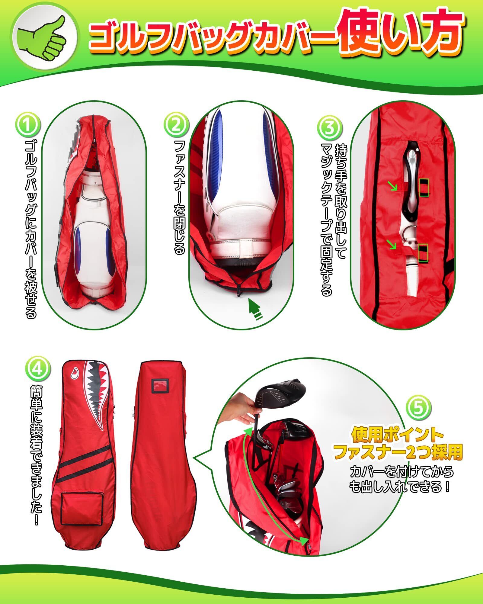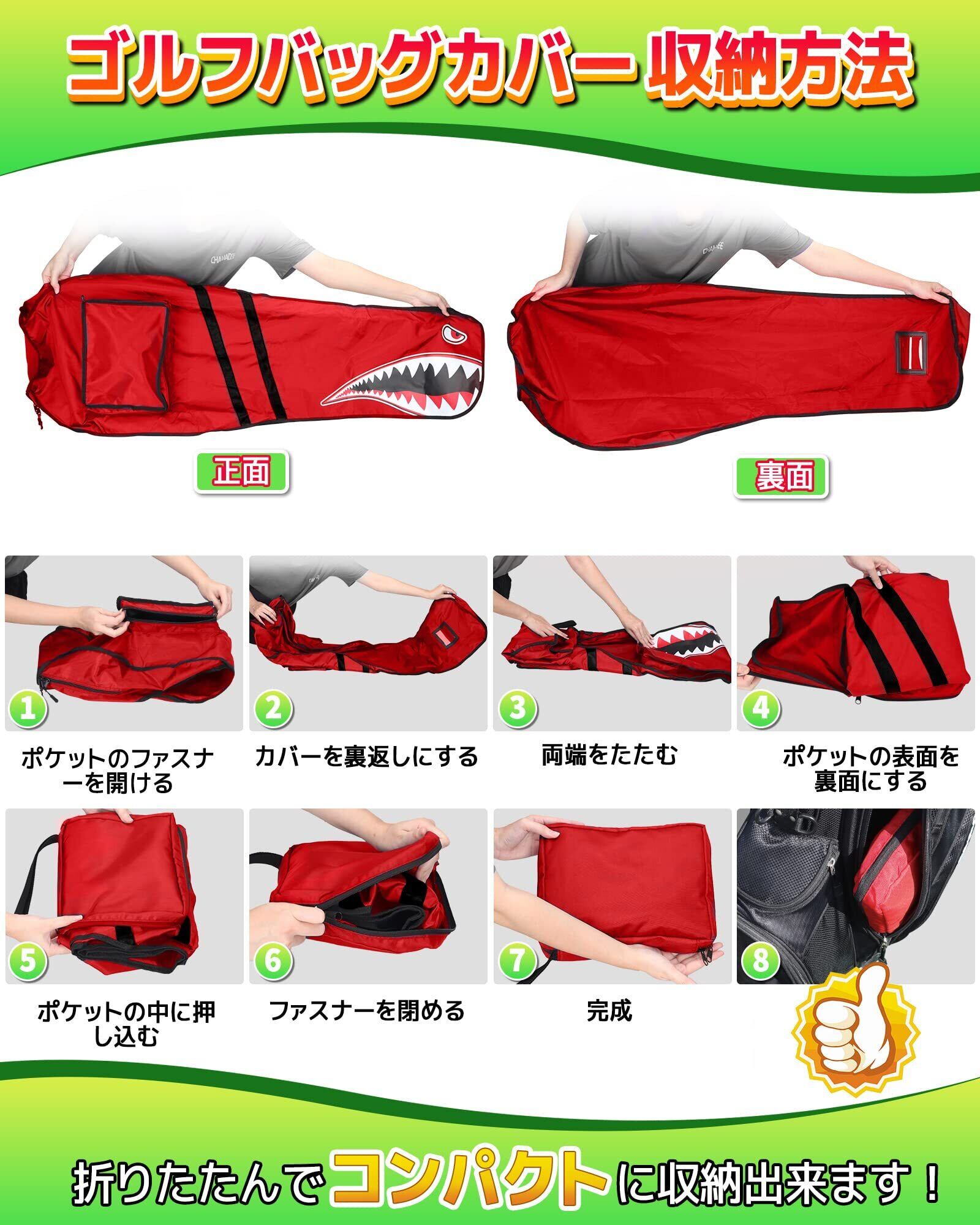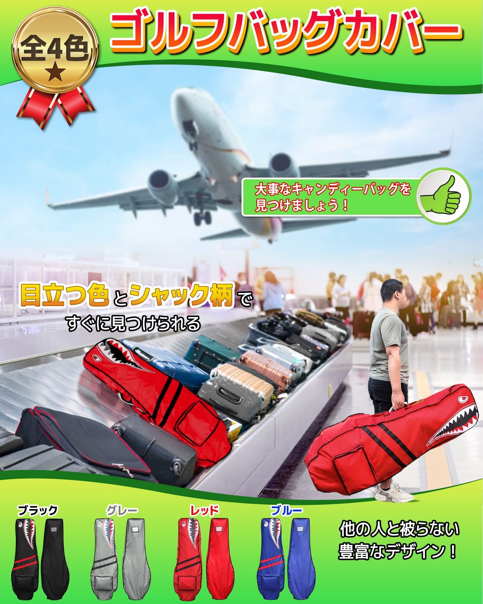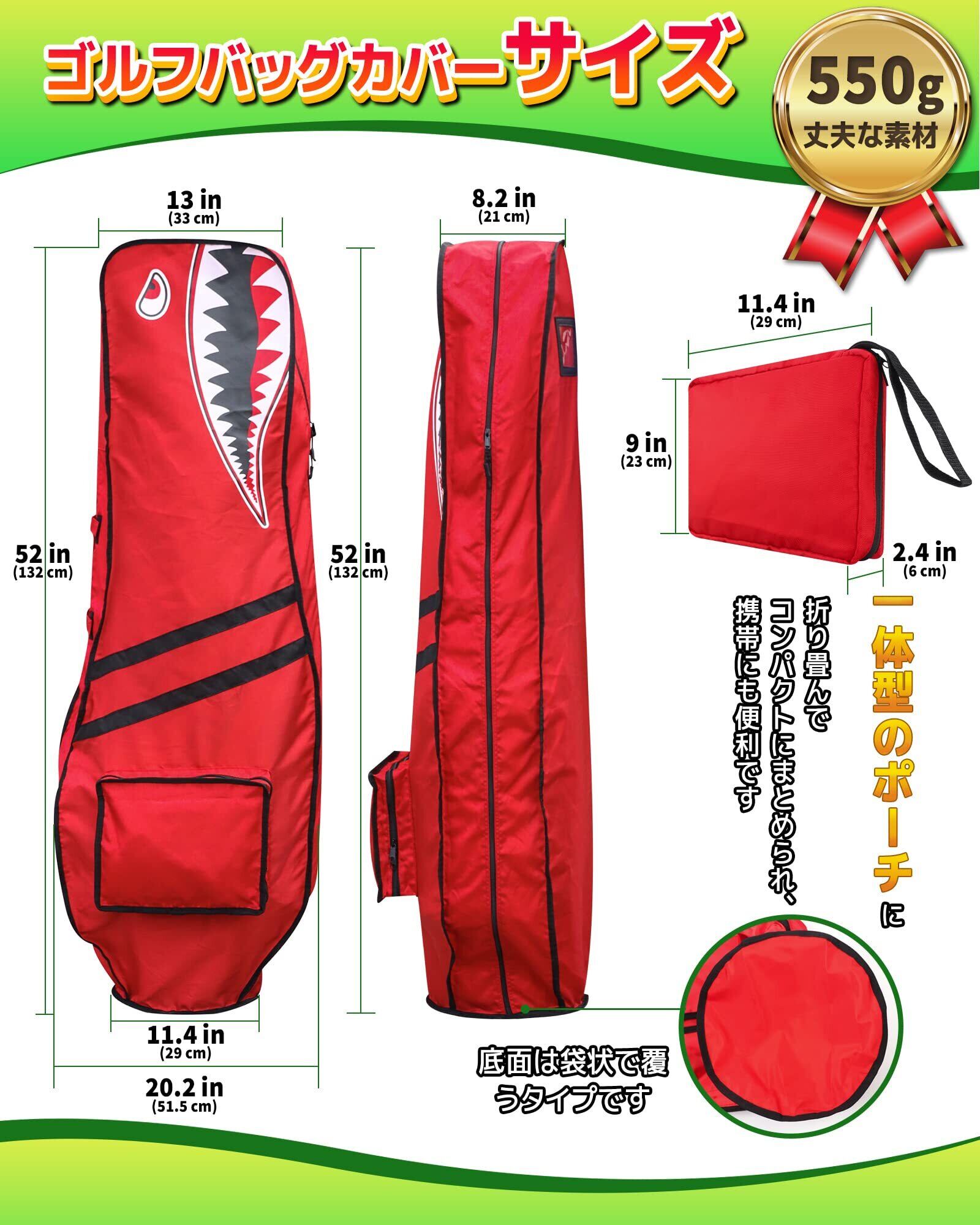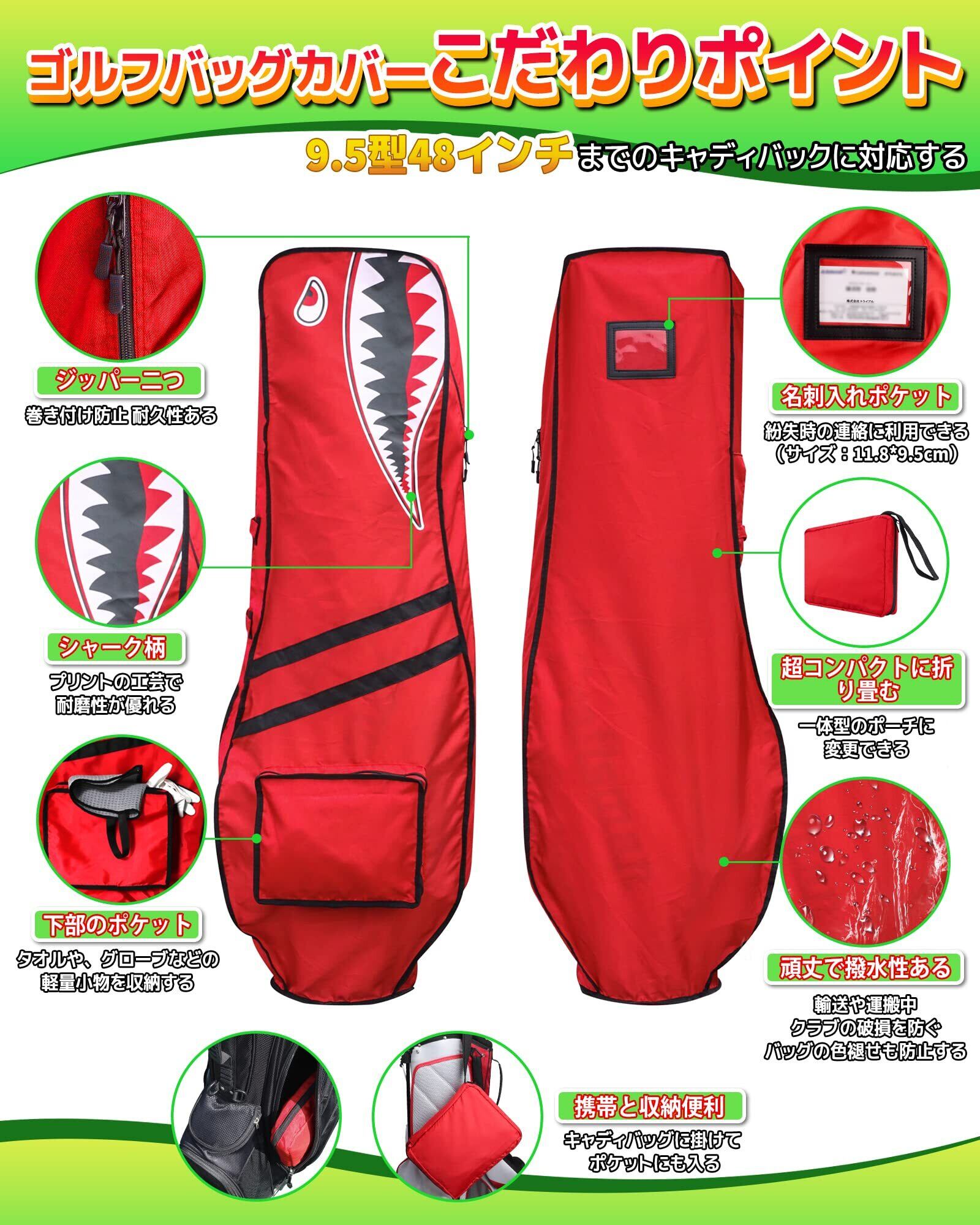 ゴルフバッグカバー トラベルカバー キャディバッグ用 カバー 9.5型 48インチまで対応 軽量 タフ 頑丈 撥水 目立つ 便利な収納袋一体型 小物入れ兼収納ポーチ 折り畳み コンパクト メンズ レディース シャーク柄 4色(ブラック/グレー/レッド/ブルー) 単品販売