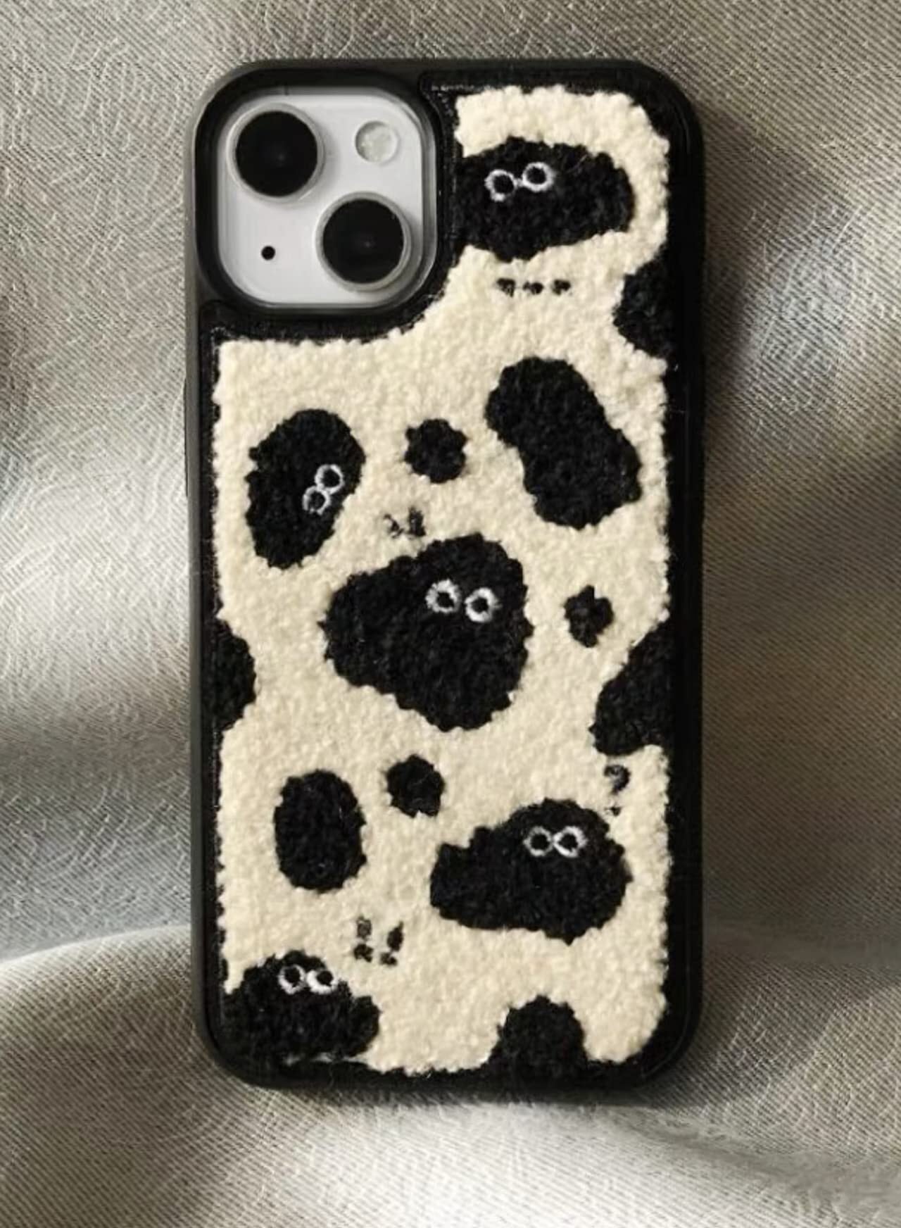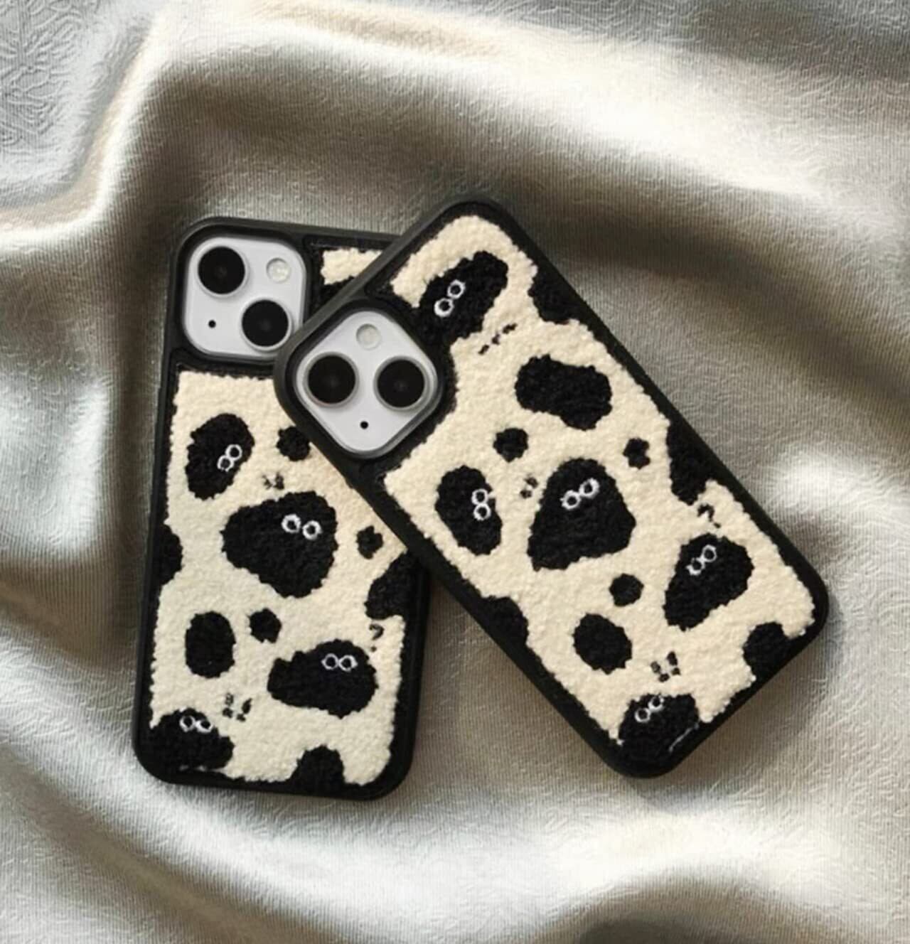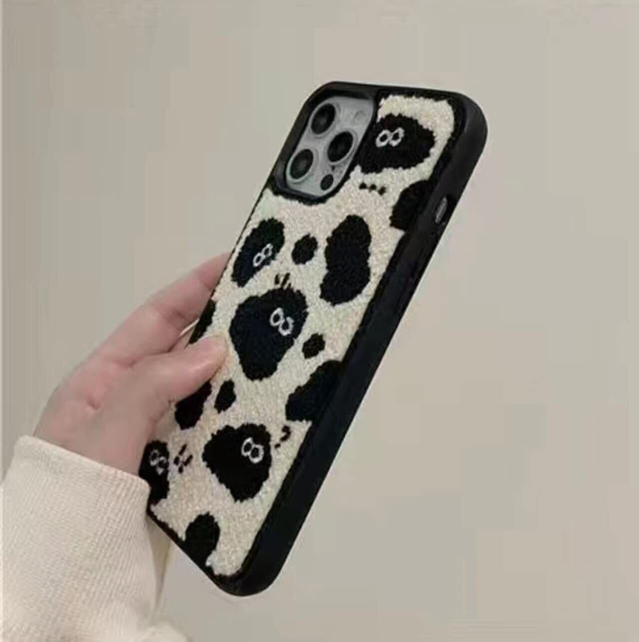 Kunyehdo スマホケース iPhone 13 iPhone14 兼用 ケース カバー iPhoneケース ぬいぐるみ かわいい 乳牛柄 牛柄 アニマル柄 韓国 おしゃれ もこもこ ふわふわ キャラクター 刺繍 模様 お洒落 おしゃれ アニメ 可愛い iphoneカバー 落下防止 保温 ソフトシェル (iPhone13/14,あんず色い底)