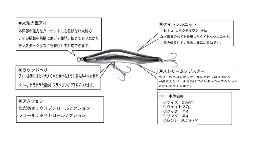 ブレイズアイ初のシンキングペンシルは「レヴォルーク99S」フィッシュイーターが狂う、キビナゴやカタクチイワシ、稚鮎などの細身のベイトをイメージしたタイトなシルエットが特徴的。ロッドワークで多彩なアクションを演出できます。サーフや磯、大河川まわりなど飛距離が必要なエリアで活躍するシンキングペンシルの登場です。
