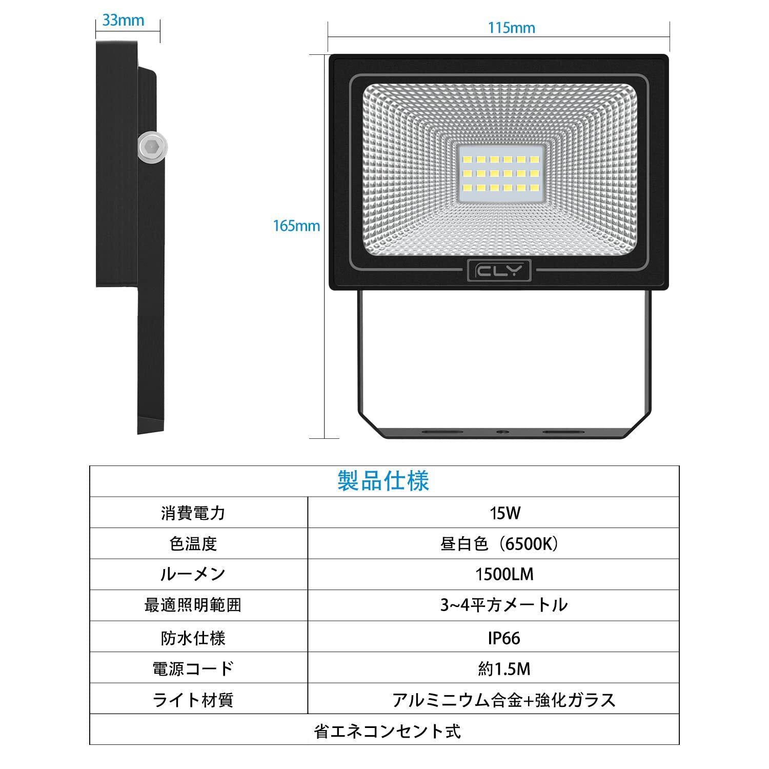 CLY 投光器 15W 昼白色 屋外ウォールライト 玄関ライト 防犯ライト 作業灯 集魚灯 駐車場灯 看板灯 省エネ 高輝度 6500K 1500LM IP66防水 工場 体育館 倉庫 ナイター 壁掛け 庭園 ベランダ 廊下 屋外 天井照明用 1.5Mケーブル 日本語説明書付き PSE認証済み 2ピン口プラグ