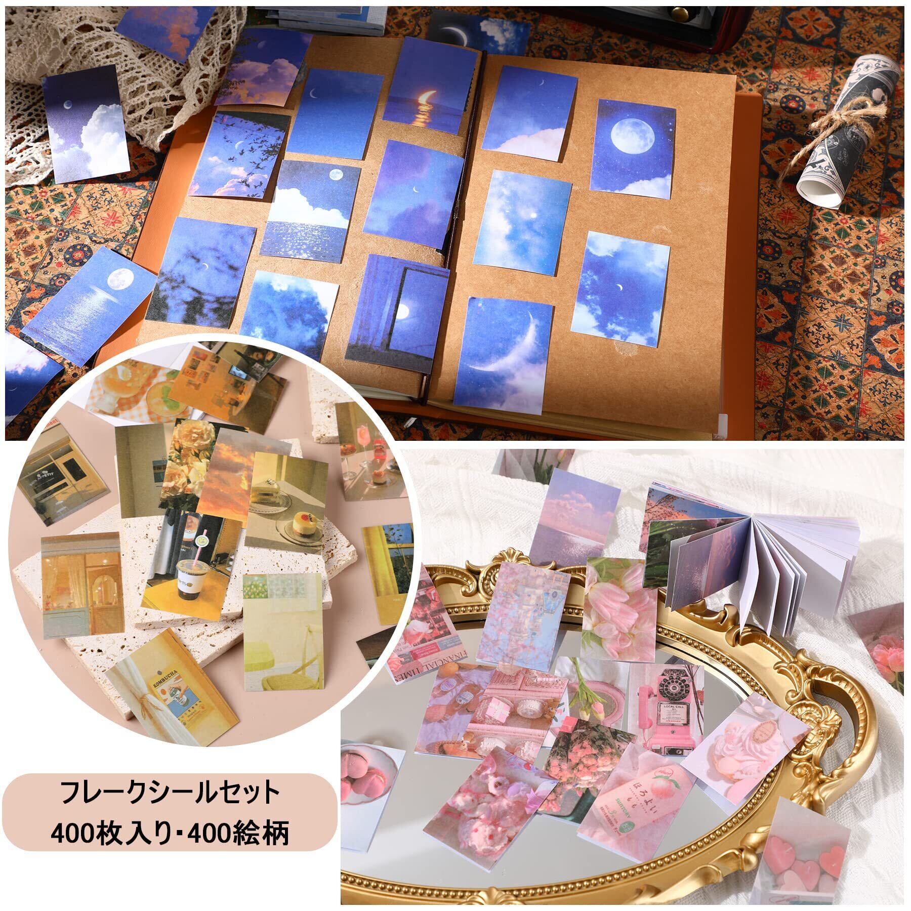 【十分な量】8冊のコラージュシールブックが入っており、各冊にも50枚、合計400枚のフレークシールがあります。大量なセットで長く使えます。シールのサイズが4cmX6cmで、持ち運びにも便利です。