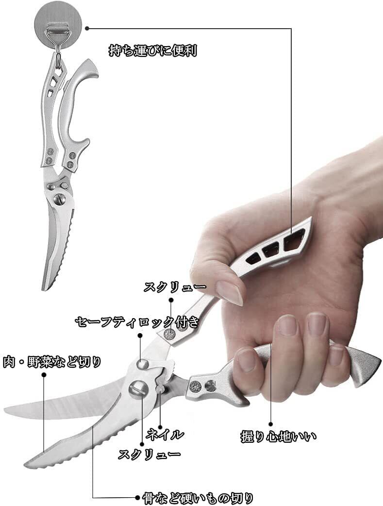 5、多機能キッチンはさみ:野菜・果物・お肉、更に鶏手羽、えび、貝類でも簡単に切り分けるキッチンバサミです。
