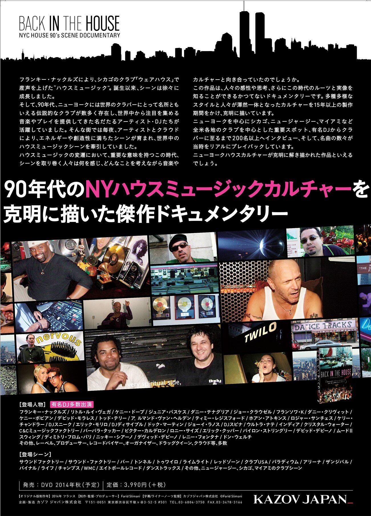 90年代NYハウスミュージックシーンのドキュメンタリー映画『BACK IN THE HOUSE(バックインザハウス)』。日本では芝浦GOLD、西麻布イエローなどでハウスミュージックが隆盛を極めていた頃の本場NYシーンをドキュメントした作品です。■内容のあらまし・1990年代、世界のクラブをけん引したニューヨーク発のクラブ音楽に携わる 人間やシーンを描いたドキュメンタリー映画です。・90年半ばから2010年までの約15年間かけて撮影されました。・ニューヨークを中心とした当時のクラブシーン、クラブ関係者のインタビュー、音楽フェスティバルなど多彩なフッテージで構成されています。また、当時を知るものならだれでも知る数々のヒット曲も劇中で視聴できます。■この映画の主旨/テーマ世界中を席巻したニューヨークのハウスカルチャーは、多種多様な人々が混然一体となって参加し育まれた歴史に魅力の根源が詰まっていることを伝えています。今もって世界中から憧憬の念をもって語られる奇跡的な時間を改めて見つめる機会を得ることができます。■商品の魅力この商品には、劇中にも登場する90年代のハウスミュージックの代表曲30選をセレクトして詳しい解説を記載したブックレットが同梱されています。ミニディクショナリーとして映画と共にお楽しみください。 商品画像エリアをクリック頂くと映像の画面サンプルをご確認頂けます)。 ■■【備考】■■ 下記に「英語字幕」と表示されておりますが、当商品はブックレット、字幕スーパーともに、日本国内販売向けの日本語字幕です。通常の国内向け字幕版の映画と同様にご鑑賞いただけます。 【主な登場人物】 Frankie Knuckles(フランキー・ナックルズ )/Danny Tenaglia(ダニー・テナグリア) Louie Vega(ルイ・ヴェガ)/ Todd Terry(トッド・テリー )/ Tony Humphries(トニー・ハンフリーズ )/ Kenny Dope(ケニー・ドープ )/ David Morales(デビッド・モラレス)/junior vasquez(ジュニア・バスケス) / Joe Claussell(ジョー・クラウゼル) / Francois K(フランソワ・K) / Danny Krivit(ダニー・クリヴィット) /Timmy Regisford(ティミー・レジスフォード)/ Mood Ⅱ Swing(ムード・トゥー・スウィング) / Armand Van Helden(アルマンド・ヴァン・ヘルデン) / Juan Atkins(ホアン・アトキンス)/ Roger Sanchez(ロジャー・サンチェス) / Kerri Chandler(ケリー・チャンドラー) / Kenny Bobian(ケニー・ボビアン)/DJ Sneak(DJスニーク)/ Victor Rosado (ビクター・ロサド) / Erick Morillo (エリック・モリロ)/ Dj Disciple(DJディサイプル) / C&C Music Factory(C&Cミュージックファクトリー) /Dimitri From Paris(ディミトリ・フロム・パリス) David DePino(デビッド・デピーノ) /Steve “Silk” Hurley(スティーブ・シルク・ハーリー) Kenny Bobien(ケニー・ボビアン) /Ultra Nate(ウルトラ・ナテ) / Crystal Waters(クリスタル・ウォーターズ)/Roni SIze(ロニー・サイズ)