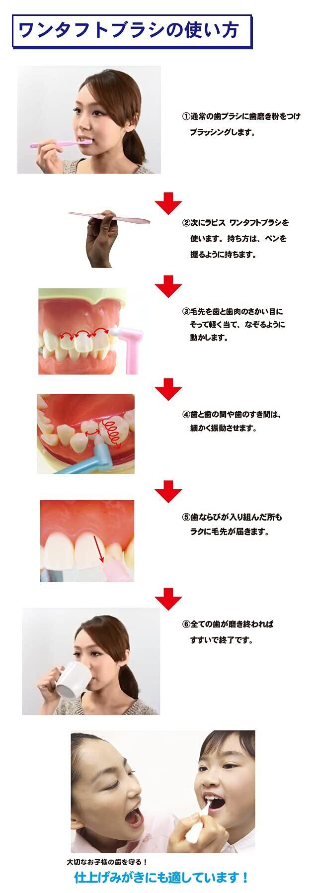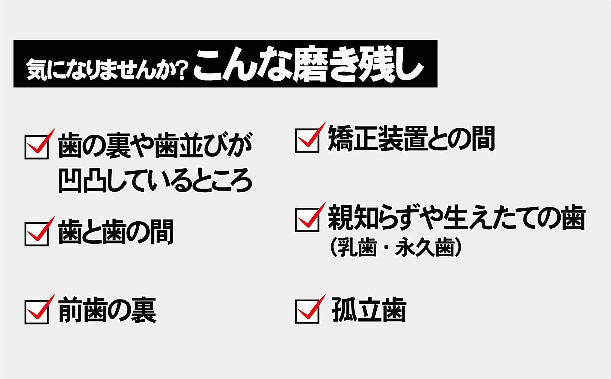 歯間部分、矯正部分の清掃に優れています。奥歯までしっかり届きます。お子様の細部の仕上げ磨きにも使っていただけます。