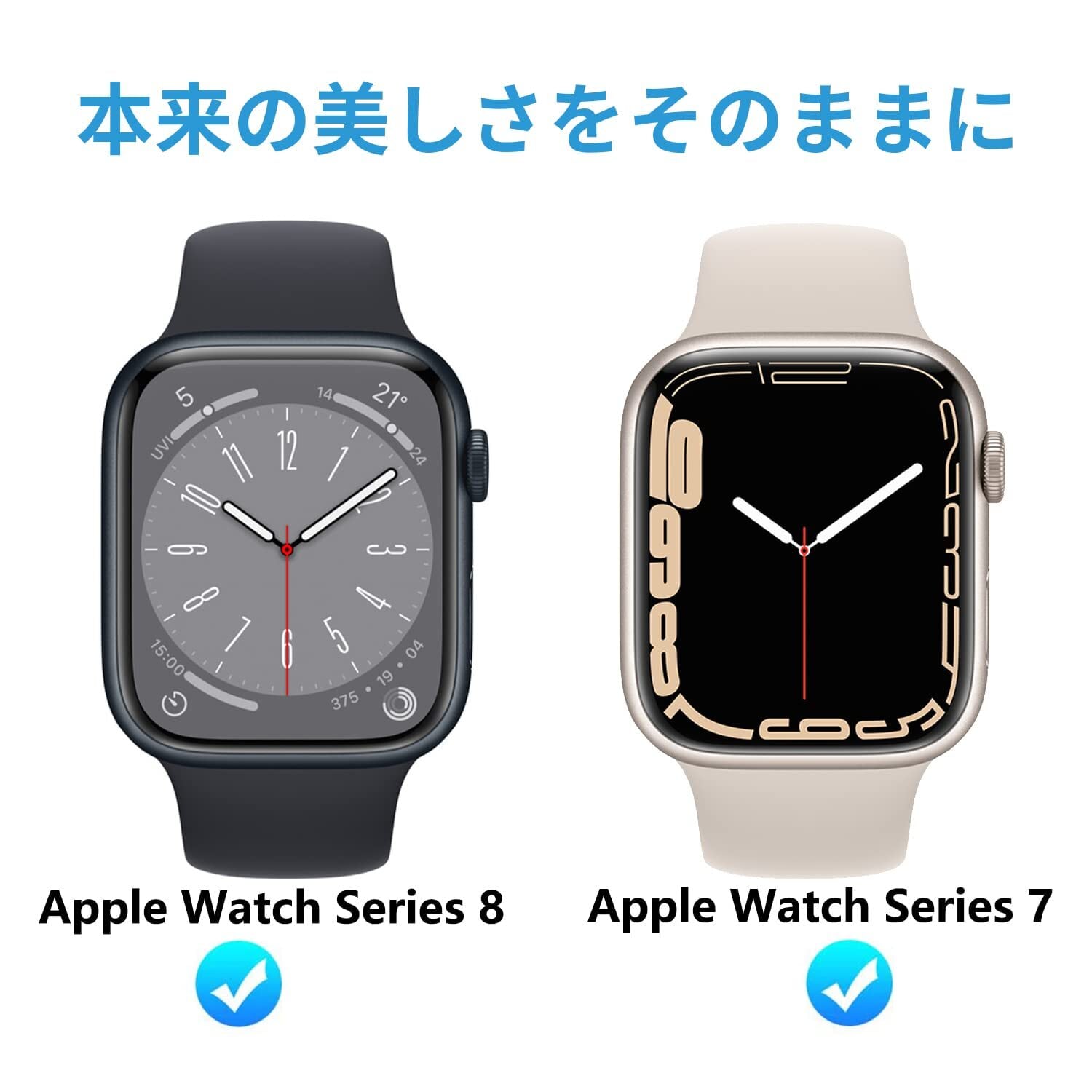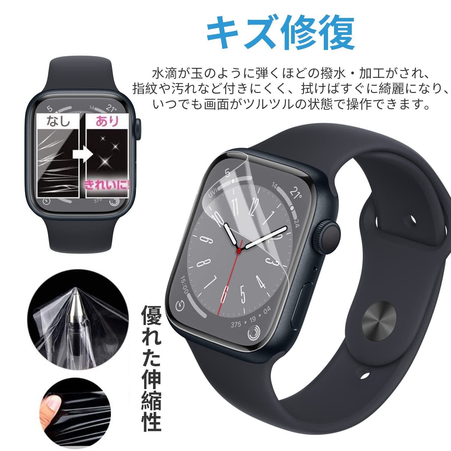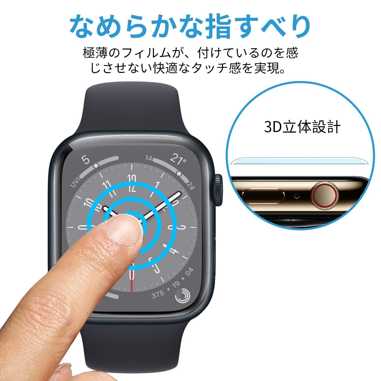 「おしゃれを損なわない」 非常に柔らかいウレタン素材を採用する事により、湾曲部分に追従し画面の端まで保護することができ、Apple Watch 8 独自のデザインを損なわず、まるでフィルムを貼ってないような仕上がりになります。対応機種:Apple Watch Series 7 45mm,Apple Watch Series 8 45mm,Apple Watch Series 9 45mm,Apple Watch Series 6/SE/5/4 44mm。