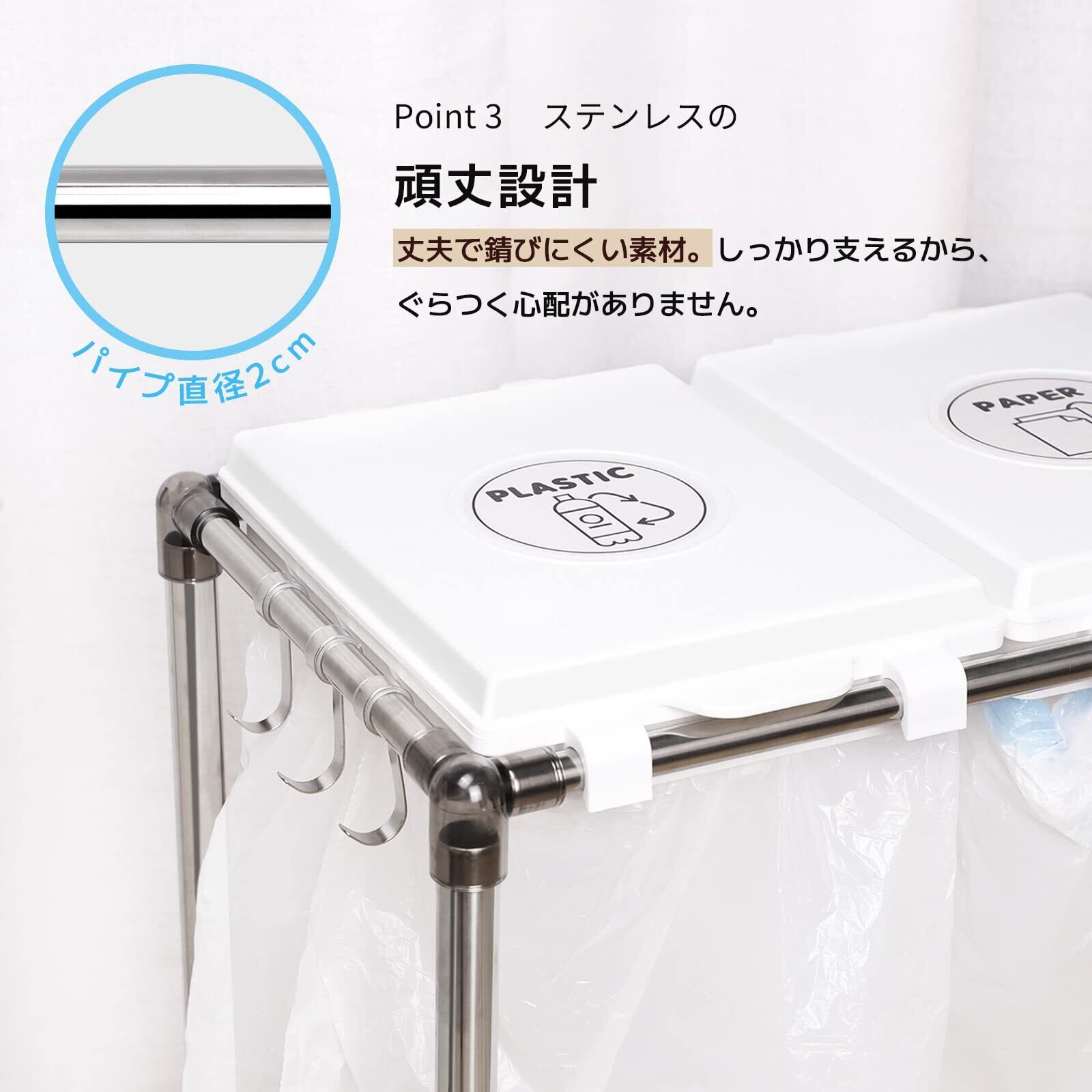 【安定感のあるステンレス製パイプ】✨ごみ袋ホルダーは直径2cmのステンレス製パイプでしっかり支え、錆びにくい特徴もあります。分別ダストワゴの底部にスイスイ動くキャスターが付き、お掃除の際の移動もスムーズです。4脚にロック機能付きのキャスターで足元を固定してぐらつき防止できます。