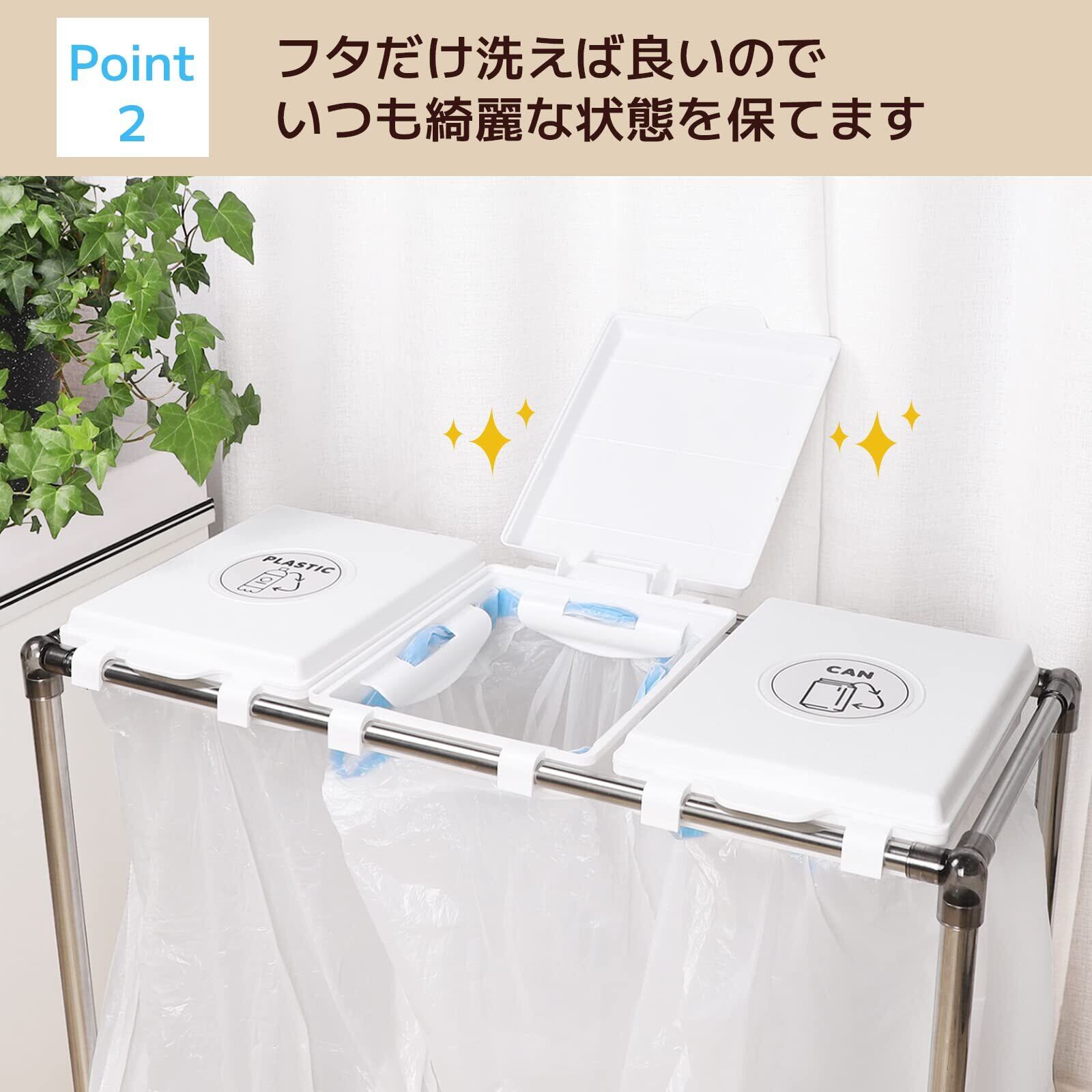 【便利さにこだわった分別ゴミ箱】✨①底面には、ごみ袋の保管にも便利なフレームが備わって、ゴミ出しの時の袋の交換がスムーズになります。大きなゴミ袋でも床に擦れて破ける心配なくセットできます。②サイドフックは普段あまり出ないゴミや溜まるのに時間がかかるようなゴミの指定位置に、例えば乾電池やブルダブなど小さいな分別におすすめです。勿論小物類の吊り下げ収納にもOK、無駄なく活用。