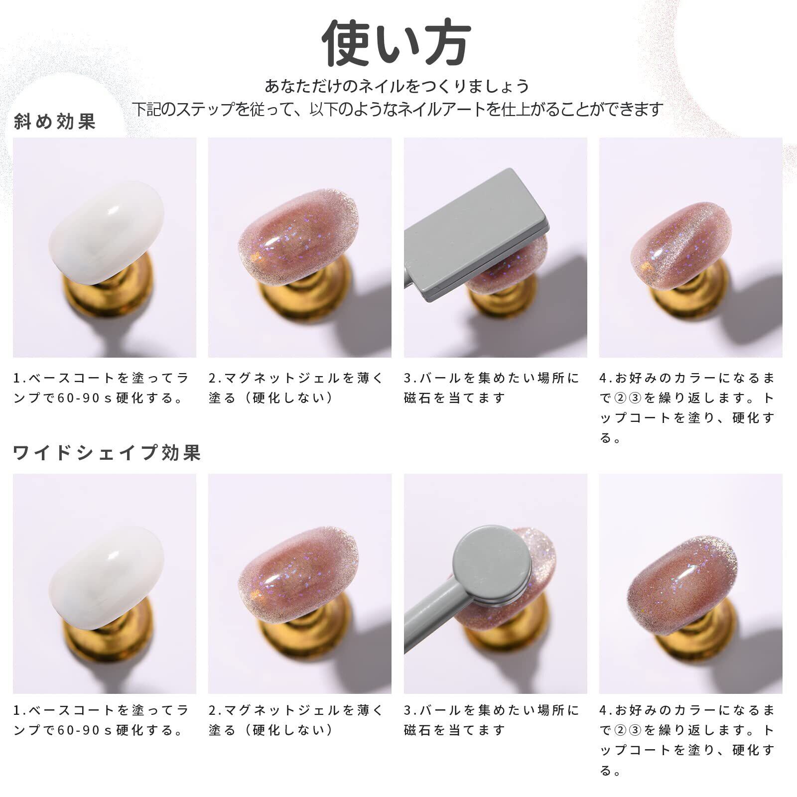 操作簡単:少し離して、上から素早くふわふわっと当てると、万遍なく輝きます。角度によって違う表情を見せる不思議なアートが出来ます。奥行きのある輝きでマグネットジェルならではのグリッターとはひと味違う、奥行きがあり動きのある輝きを作ります