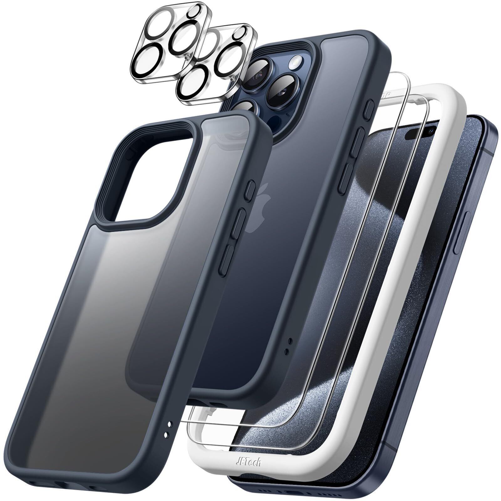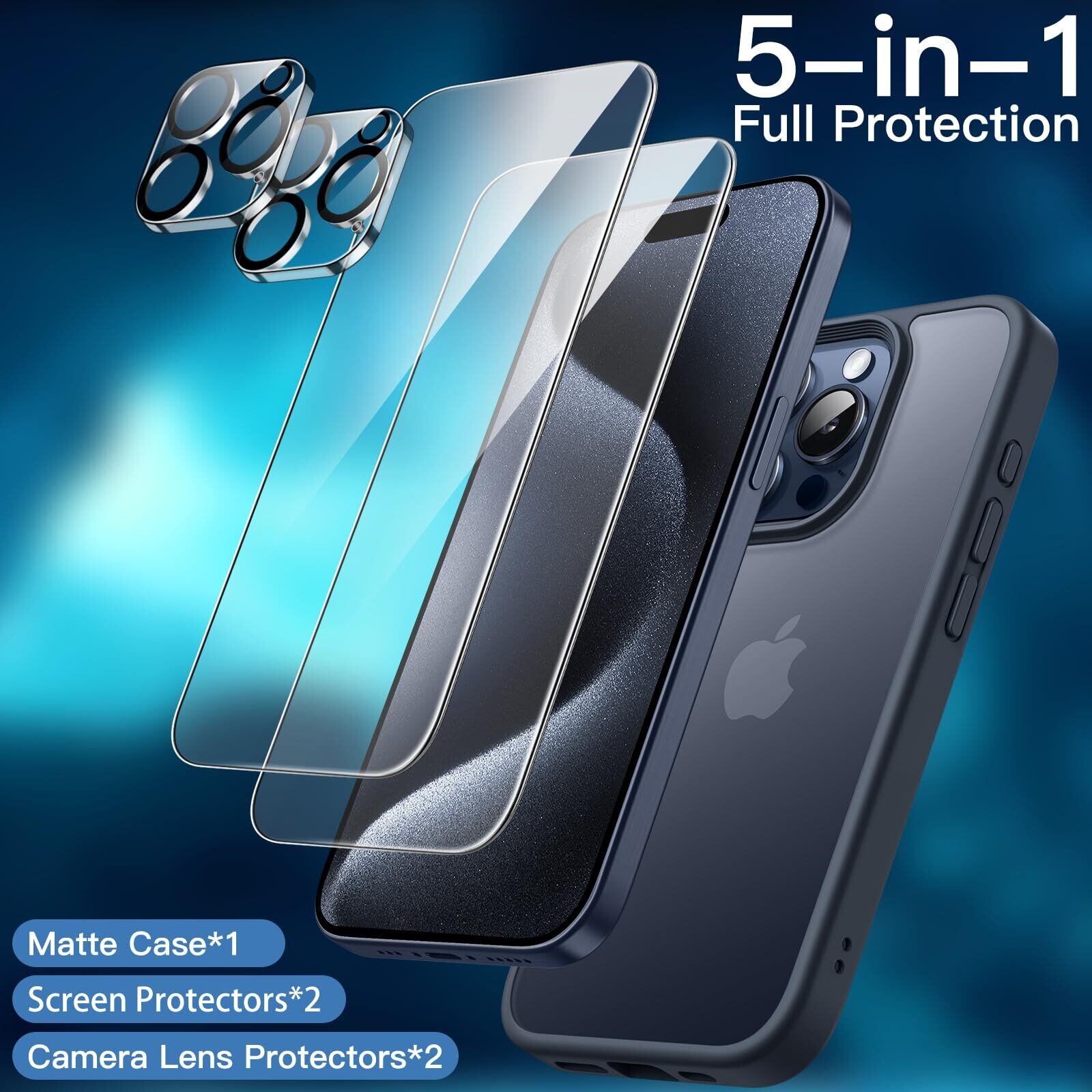 JEDirect 5 in 1 iPhone15ProMax 6.7インチ用 (15 Pro Maxに対応) マットケース 2枚強化ガラスフィルム+2枚カメラレンズフィルム付き 5枚セット 半透明背面 耐衝撃スマホカバー (ブルー)