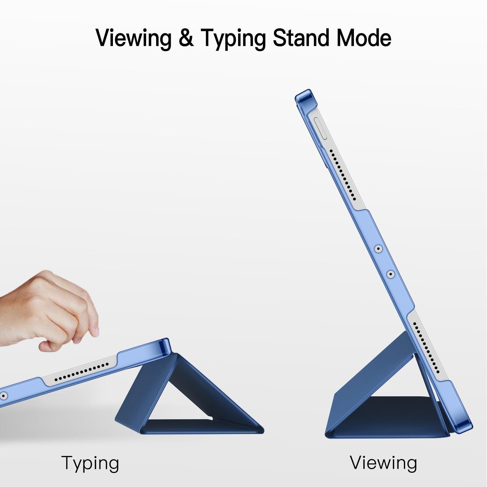 マグネット内蔵、オートスリープとオートウェイクアップ機能が付きます。三つ折りフロントカバーにより、視聴とタイピングに合わせた2通りのスタンド角度を調整できます。スタンドが正しく機能していることを確認するために、折り目の正しい向きを確認してください