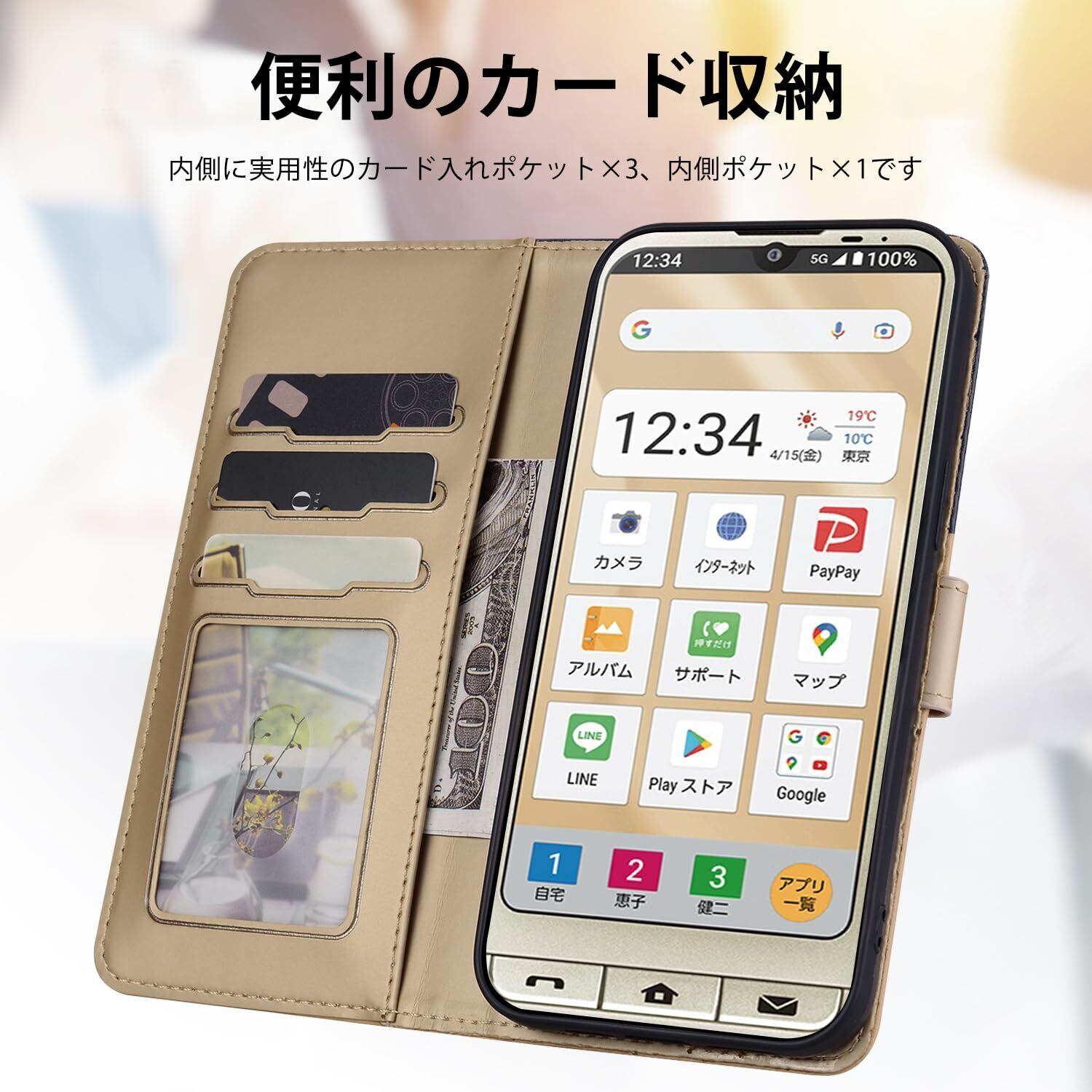 【財布型】:シンプルスマホ6 スマホケースの内側に実用性のカード入れポケット×3、内側ポケット×1、カード類、現金、駐車券、名刺、免許証入れなどを収納でき、通勤も通学にも楽々タイプです 。
