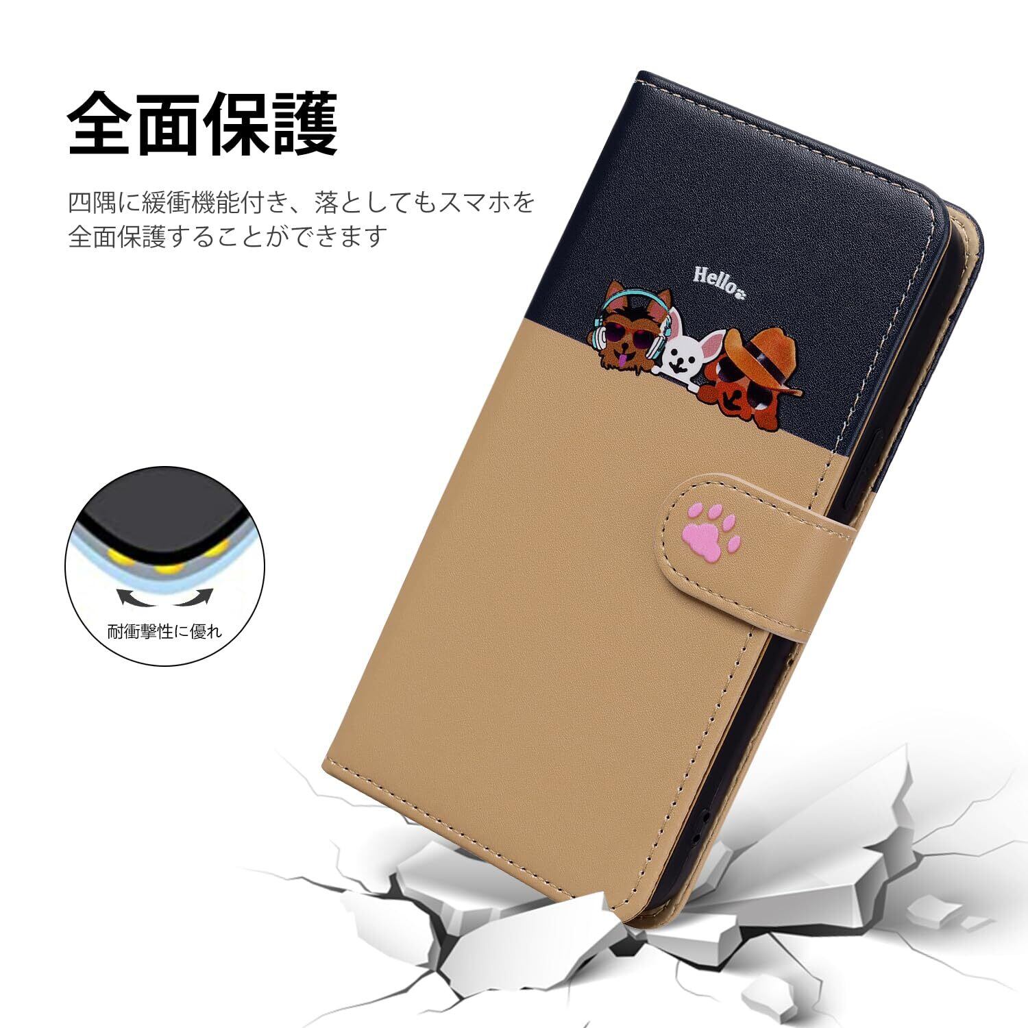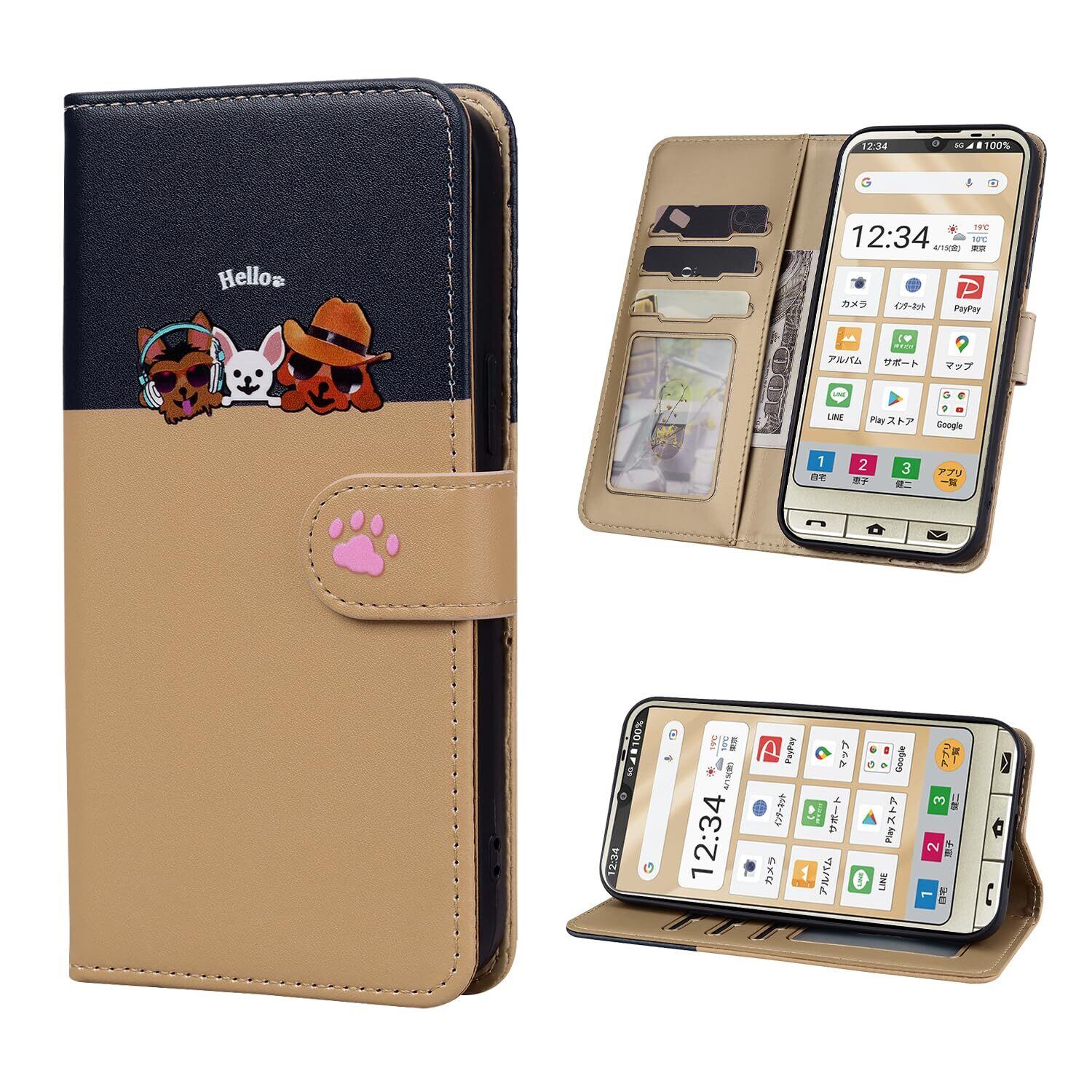 シンプルスマホ7/シンプルスマホ6 ケース 手帳型 おしゃれ simple sumaho6 A201SH/BASIO active SHG09/Basio active2 SHG12 ケース 手帳型 耐衝撃PUレザー シンプルスマホ6 A201SH ケース 手帳型 かわいい子猫犬柄 Simple Sumaho6 手帳型 スマホケース カバー カード収納 マグネット式 スタンド機能【ゴールド】