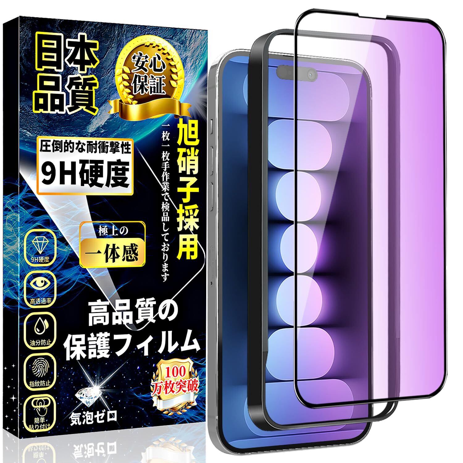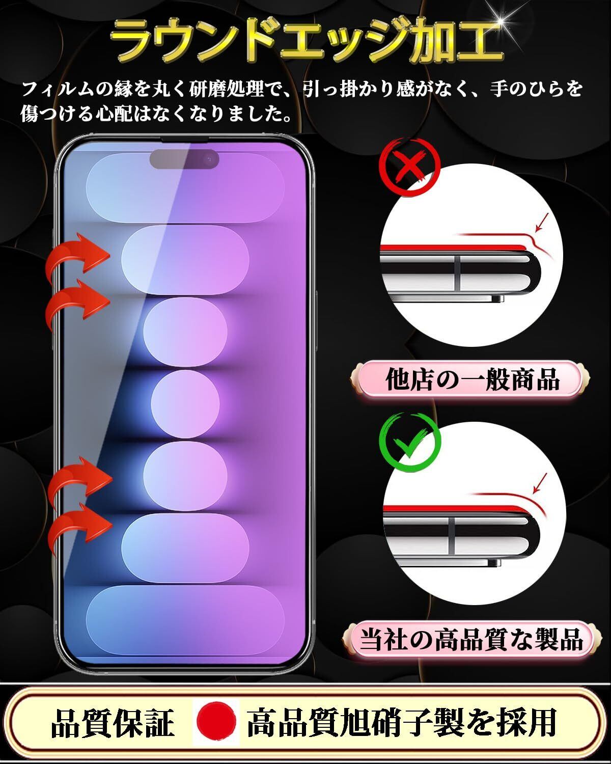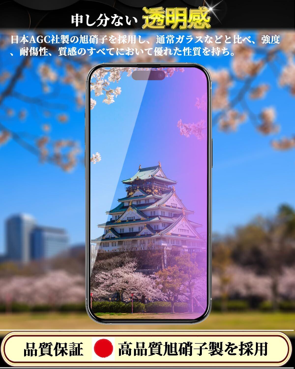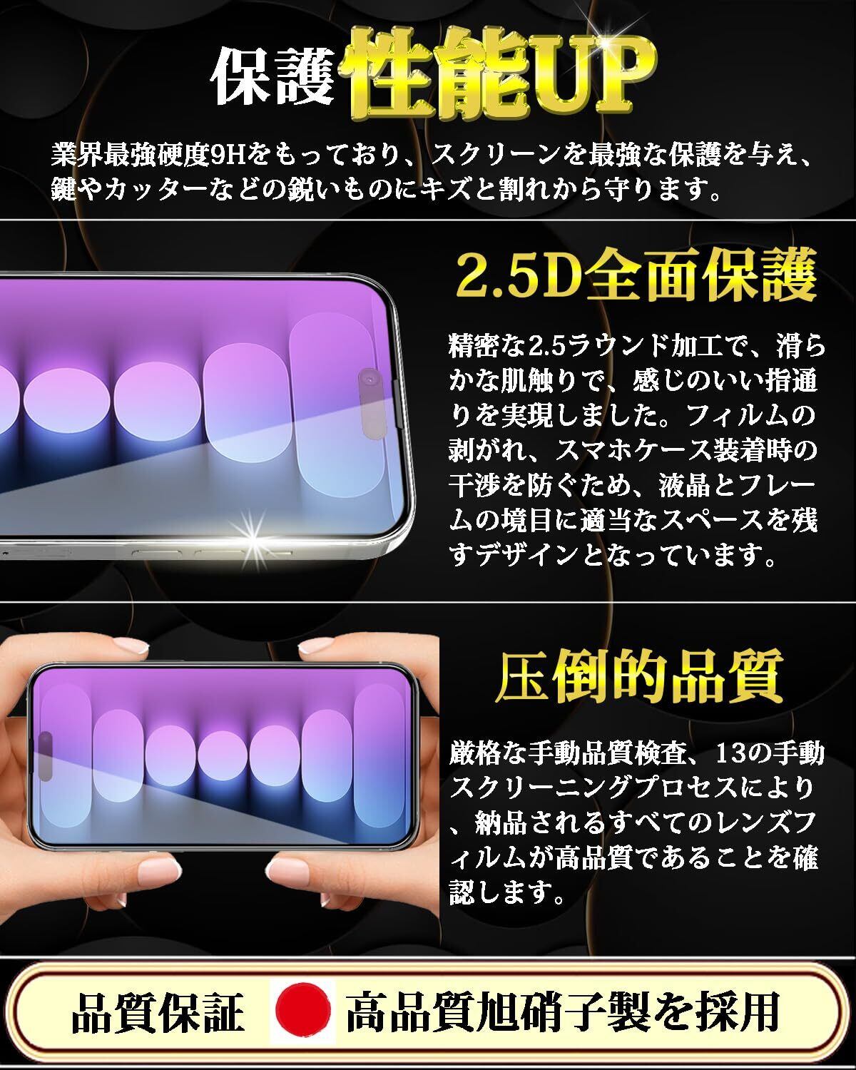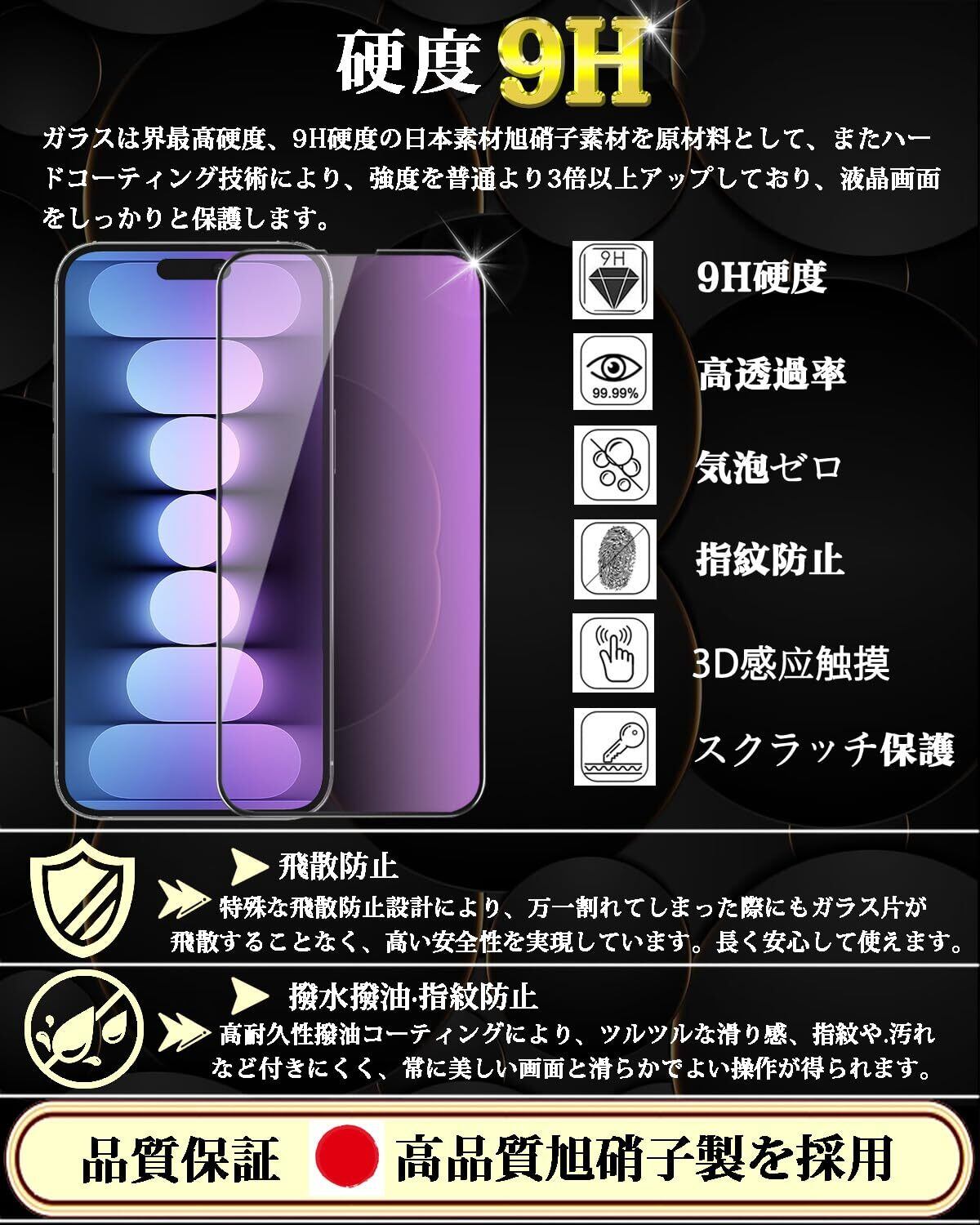 【日本製素材旭硝子製】iPhone 15 ブルーライトカット ガラスフィルムは日本製の旭硝子を素材として採用し、業界最高レベルの9H硬度を持ち、耐衝撃性と耐傷性に優れています。衝撃吸収の特性により、転落とかの外力からスマホ画面への衝撃ダメージを最小限に抑えることができます。