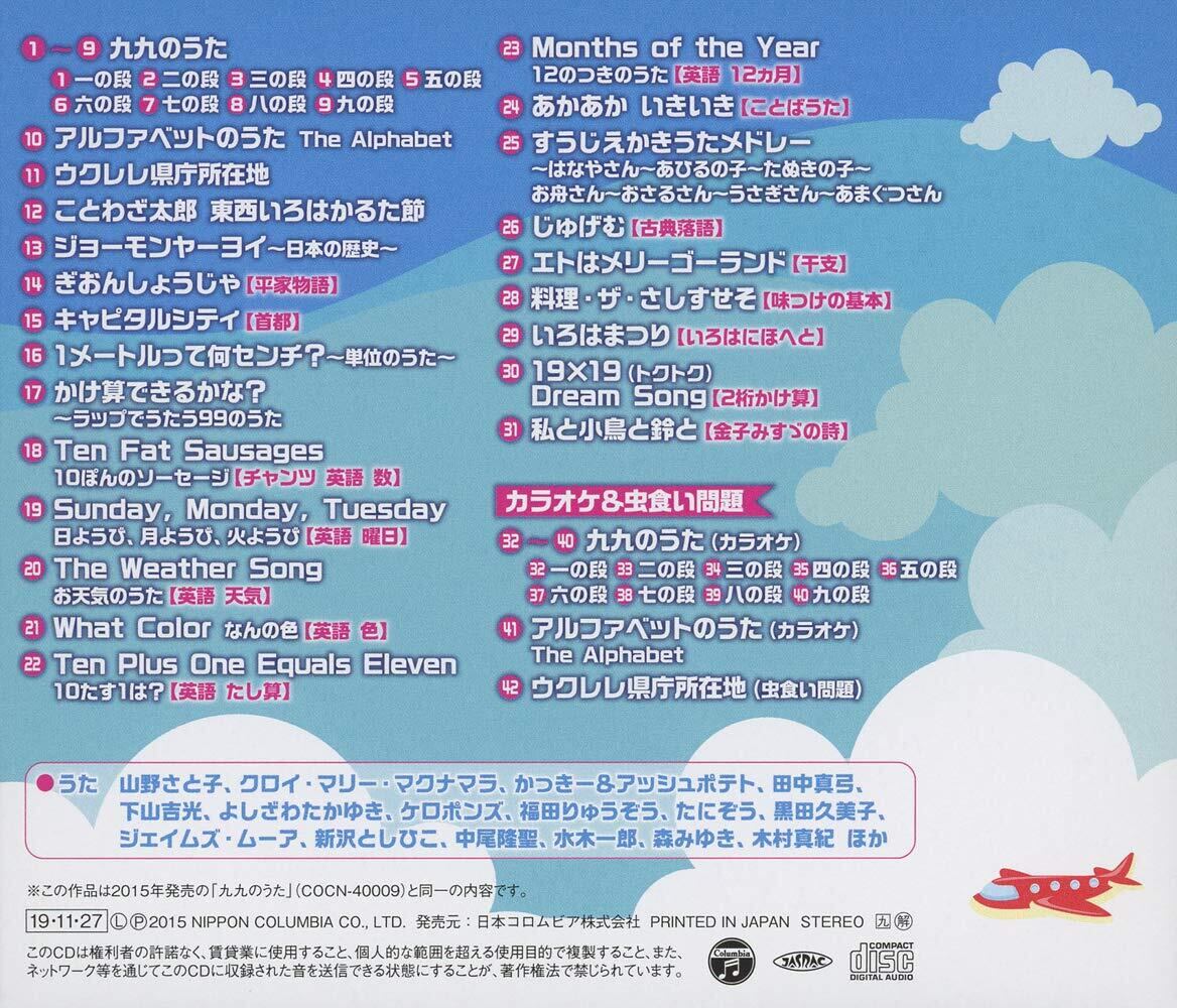 コロムビア<ザ・ベスト>シリーズ。学び応援!歌っておぼえる暗記ソング集!学校で覚える暗記項目を歌って覚えよう!九九をはじめ、英語や歴史、県庁所在地、干支やお料理まで、色々な科目の暗記ソングをぎっしり収録。 (C)RS