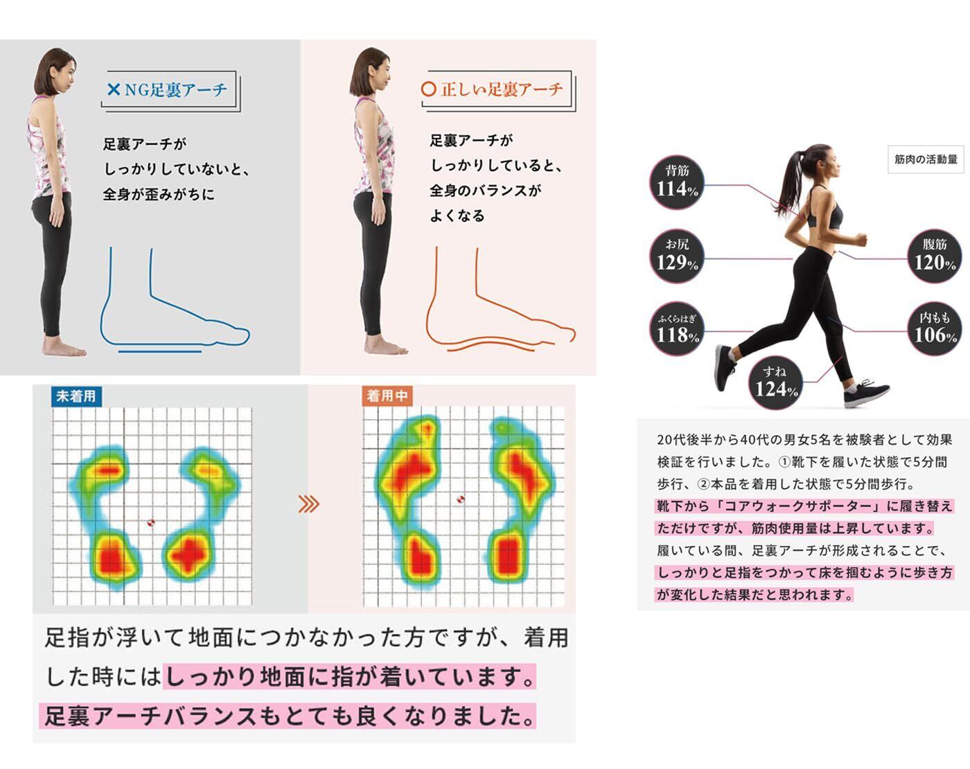 【足裏が全身の姿勢に繋がる】足の痛みを改善し、指の曲がりや疲労感などの症状を改善してくれる。ヨガ、バレエ、ダンスなど様々な運動に適応!角質ケア、乾燥対策!脚型矯正、歩くのはもっと軽い!美しい姿勢が手に入る。美筋肉使用量UPにより、掃除や買い物が筋トレレベルに。運動効率UPによるカロリー消費率UP。着地衝撃を吸収し、ひざや腰の負担を軽減 などが期待されます。足裏アーチを形成し、身体の土台を安定させます。