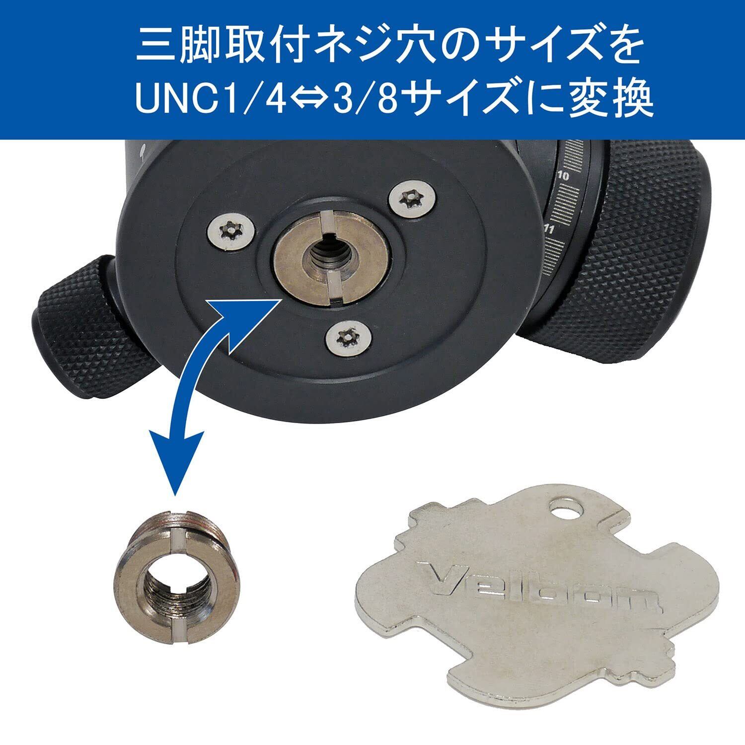 アダプターを入れ替えることで、ベルボンの雲台やアクセサリーの取付ネジ穴「UNC1/4インチ」「3/8インチ」を相互変換できます。
