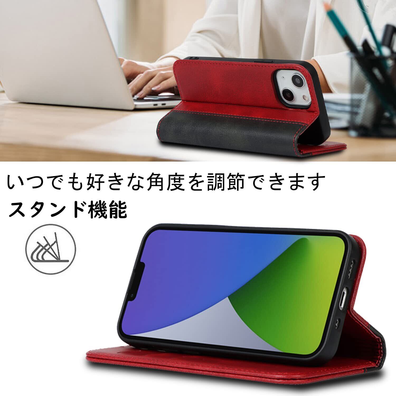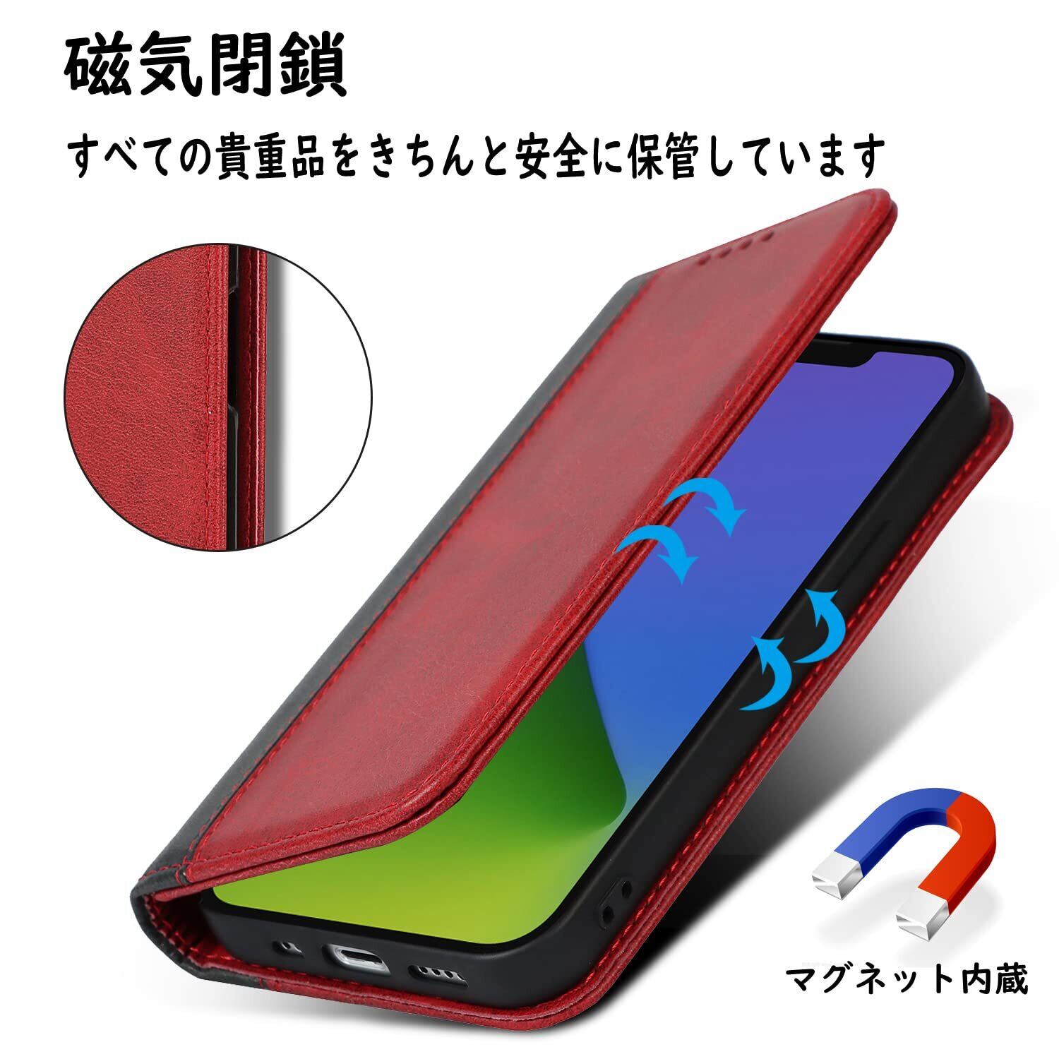 【収納機能】iPhone 14/iPhone 13ケース内側には三つのカード入れとフリーポケットがつき、カード類や紙幣、名刺などが収納できます。カードスロットに2枚のカードを入れると、内蔵マグネットの機能を最大限に発揮し、カードが消磁されるのを防ぐことができます。横置きスタンド機能が付き、横向いて斜めに立てて、自由に角度を調整して、お好みの角度で動画鑑賞や読書などを楽しめます。長時間での新幹線、飛行機の中での暇つぶしに最適です。