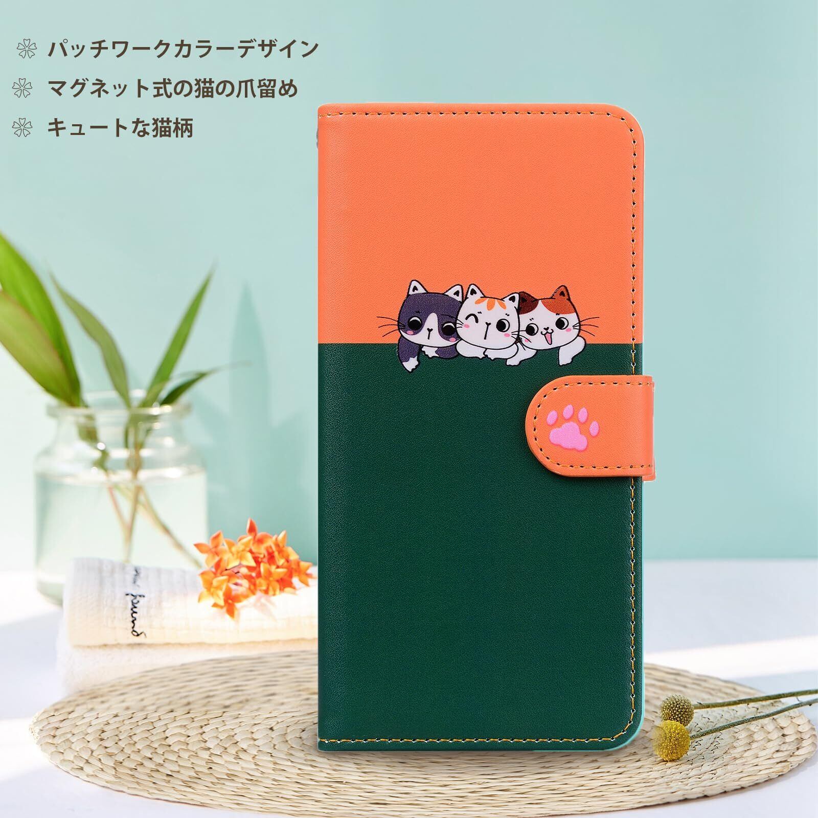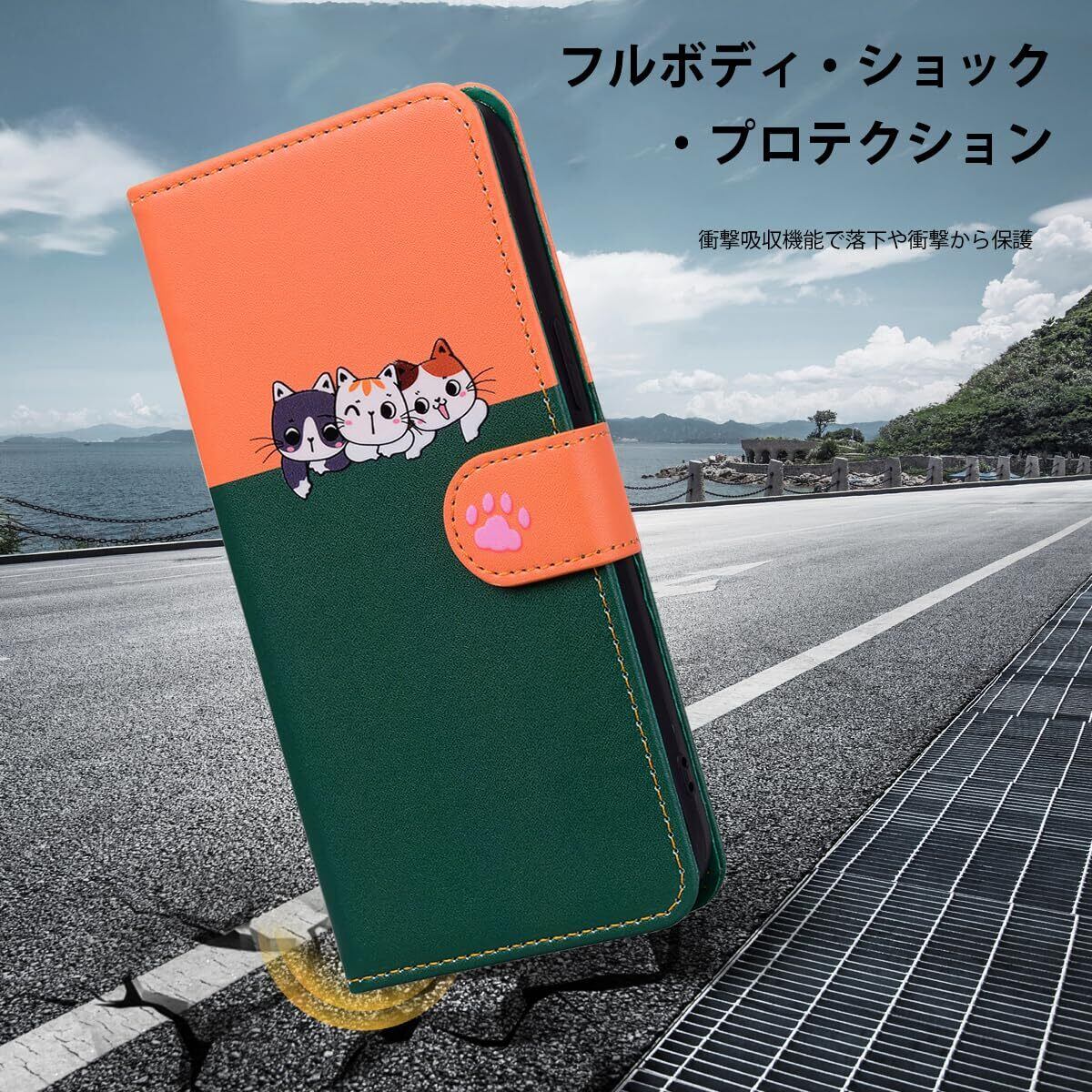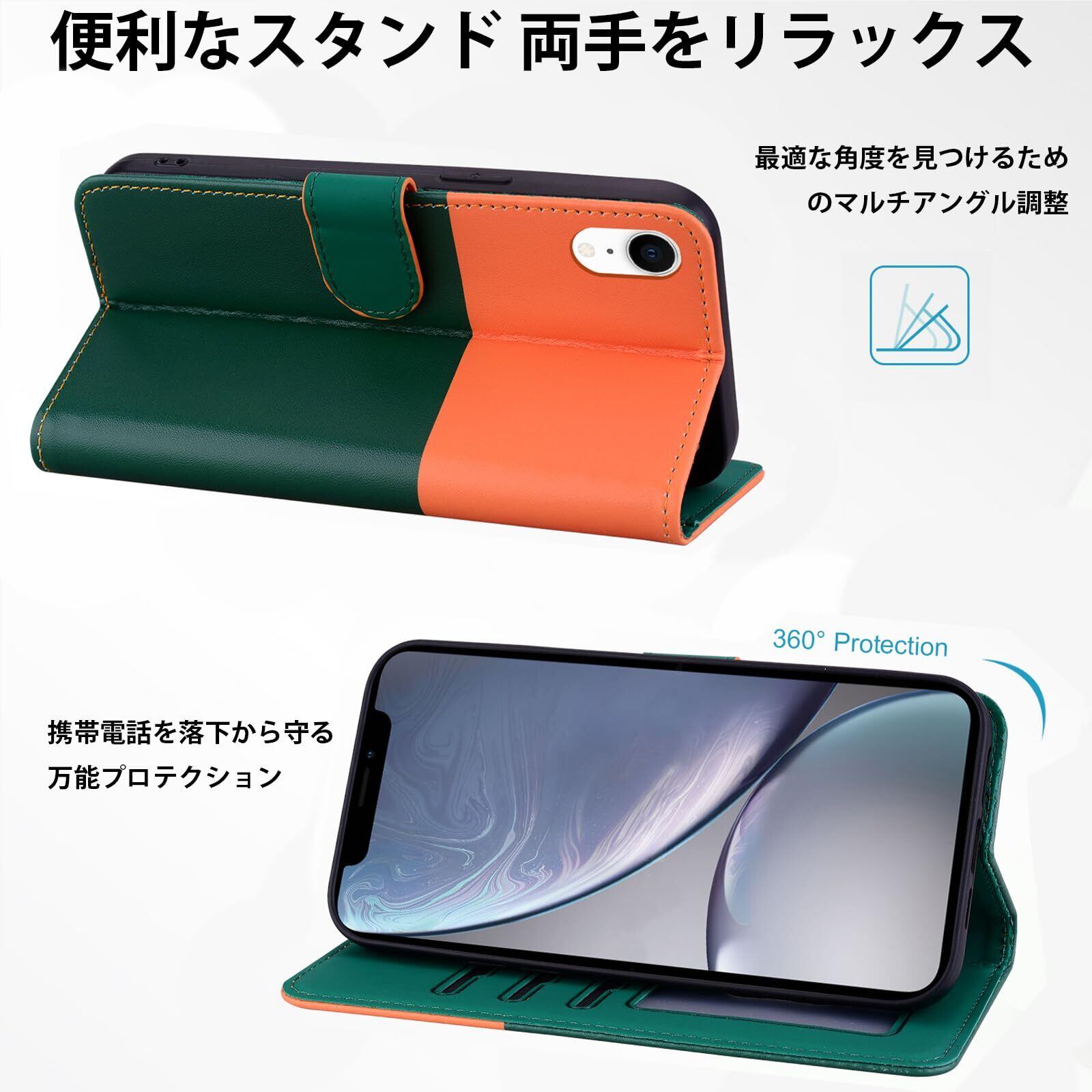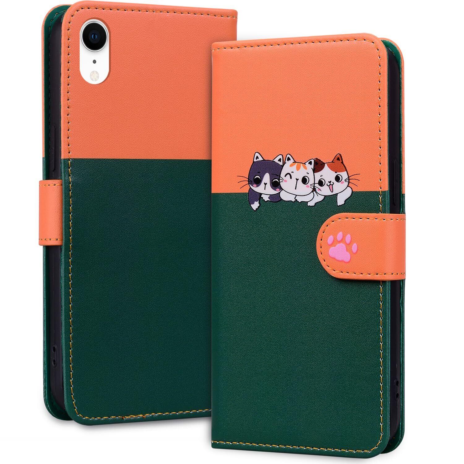 【iPhone XR ケース 手帳型】iphonexrスマホケース iphone xr ケース 財布型 iPhone XR 猫柄スマホケース iPhone XR レザースマホケース 快適な手触り XR ポケットケース かわいい 便利 衝撃吸収ソフトクッション ファッショナブルな猫の爪マグネットクラスプ 調整可能なレベリングスタンド[グリーン+オレンジ]