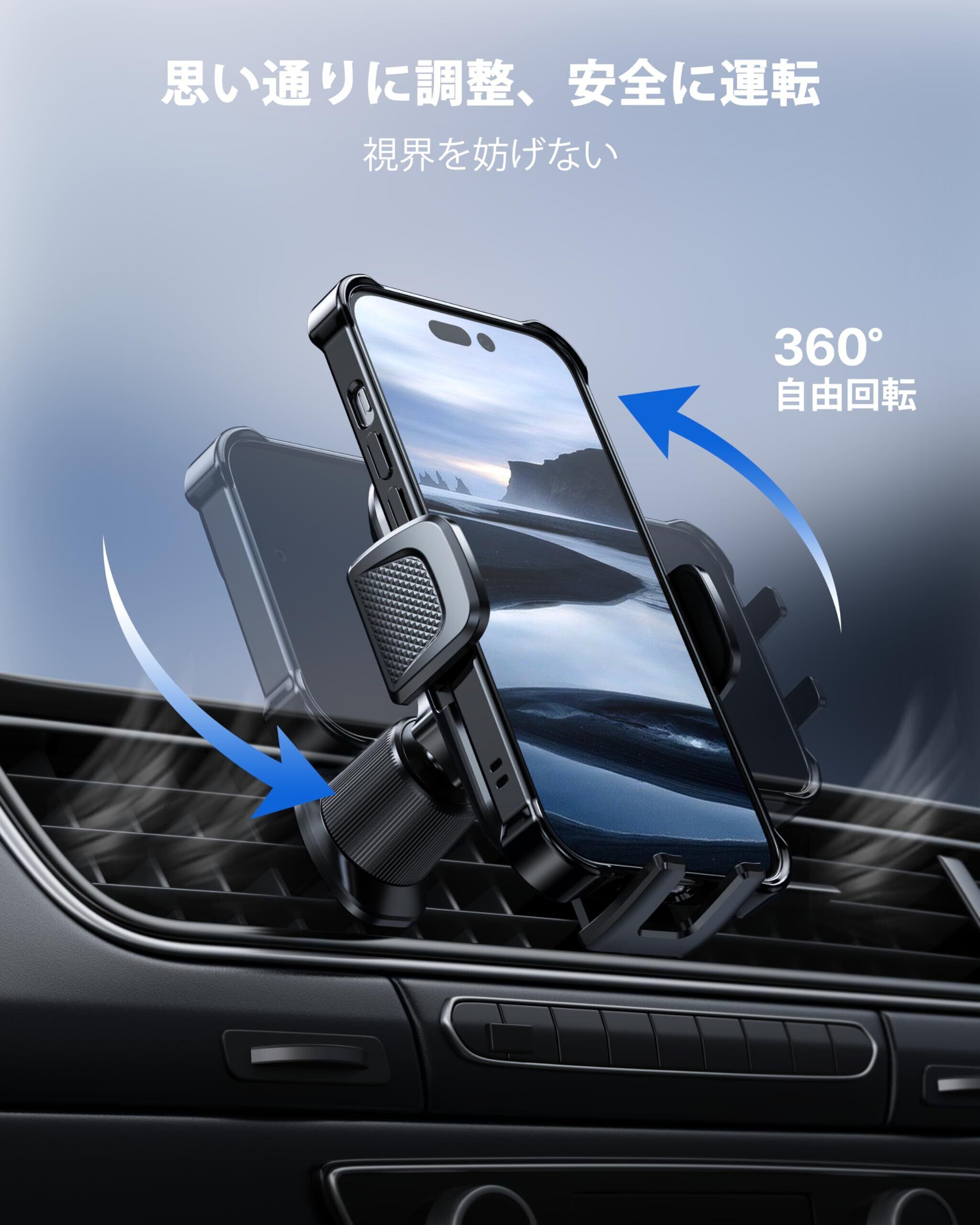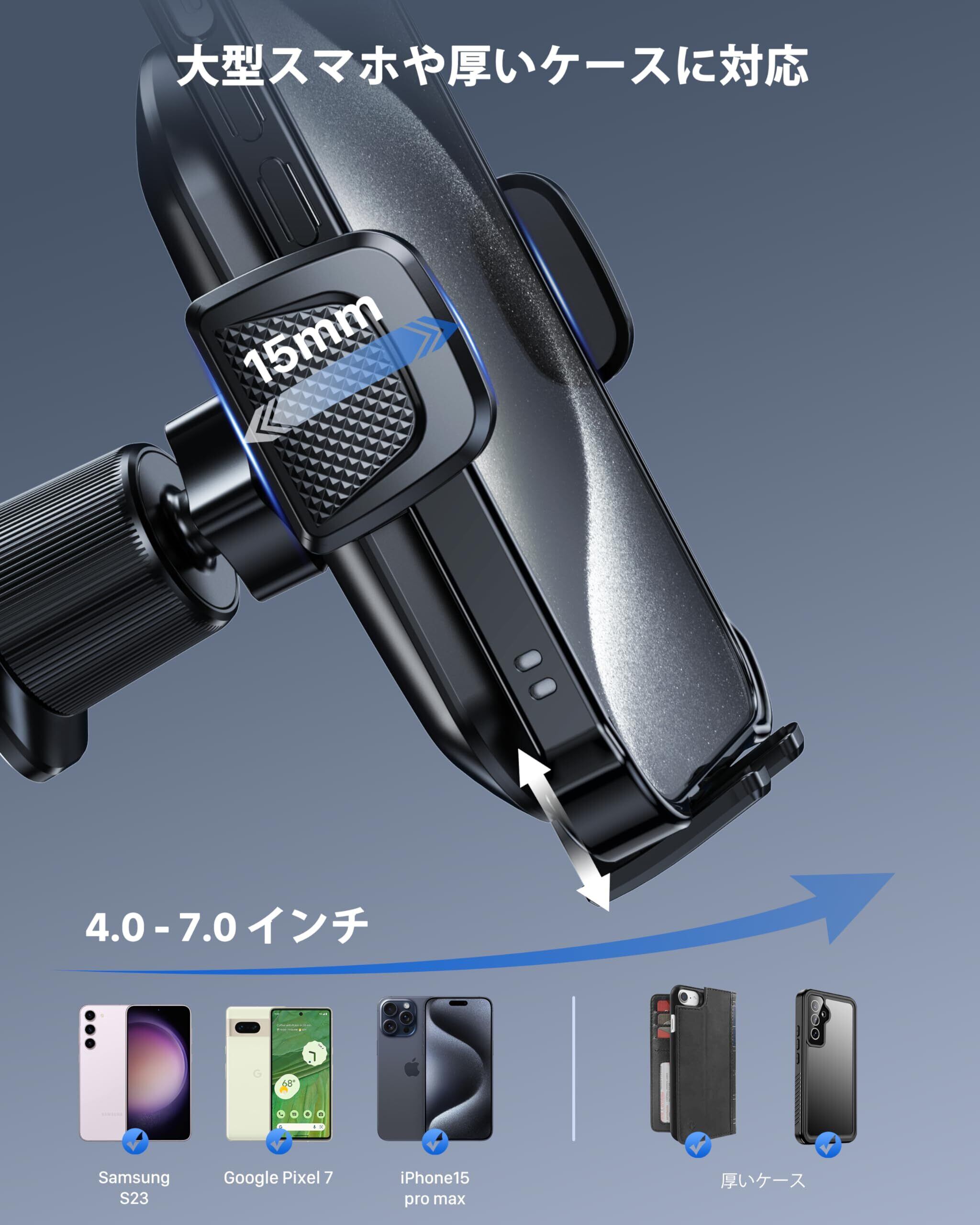 厚いケース対応&対応機種:ABS+PCの材質にレベルアップし、硬くて高温にも耐えられます。改良されたクランプアームは15mmの深さを持ち、スマホケースの厚さを確認することをお勧めします。4インチ~7インチのスマホに対応します。対応機種の例:iPhone 16/15/14/13/12/11 Pro Max、X/XR/8/7 Plus、Samsung Galaxy S23/S22 Ultra/S21/S20/S10/A21/A12 Note 20、Huawei Mate40 Pro/Mate40 Pro+/P40 Pro/P40 Pro+など。