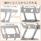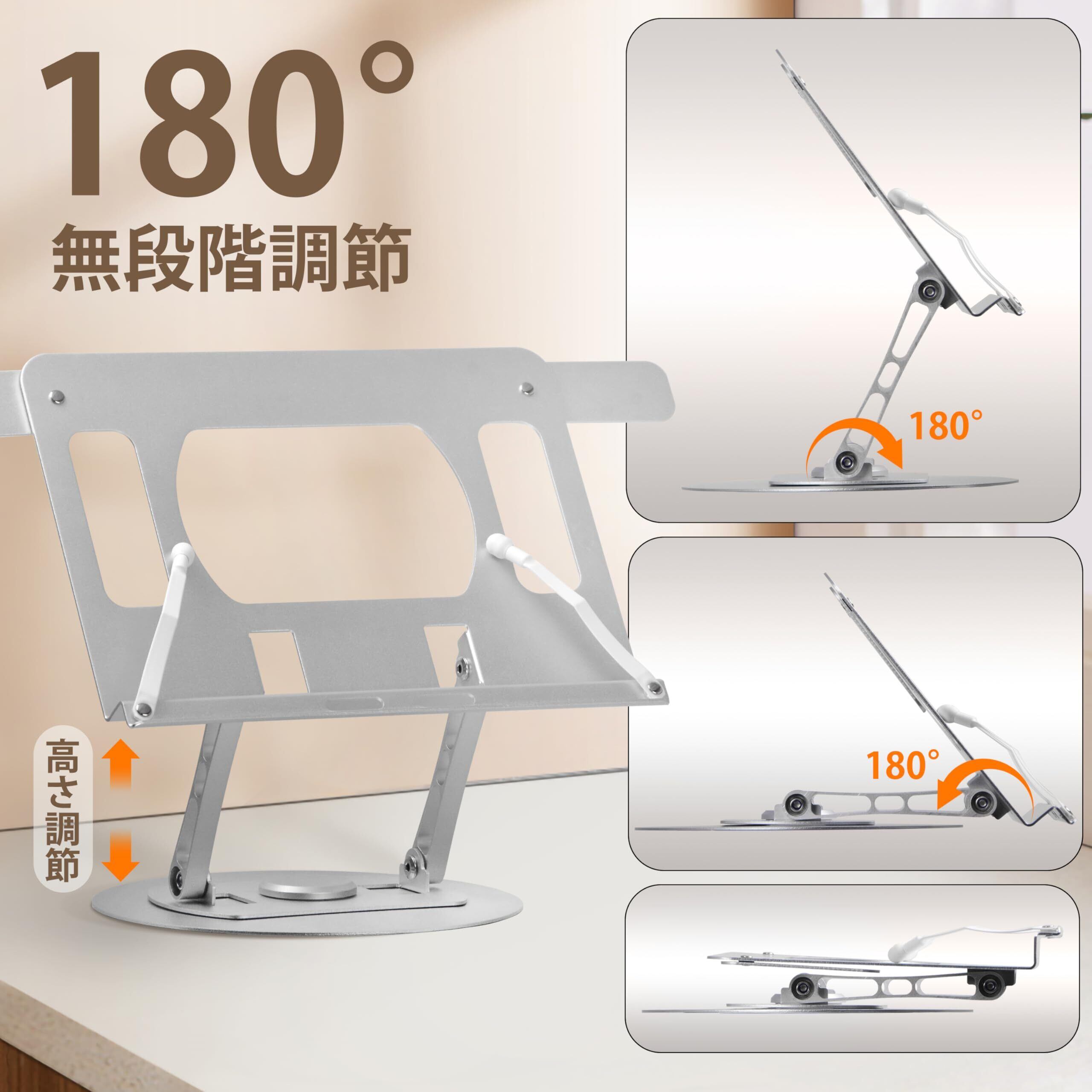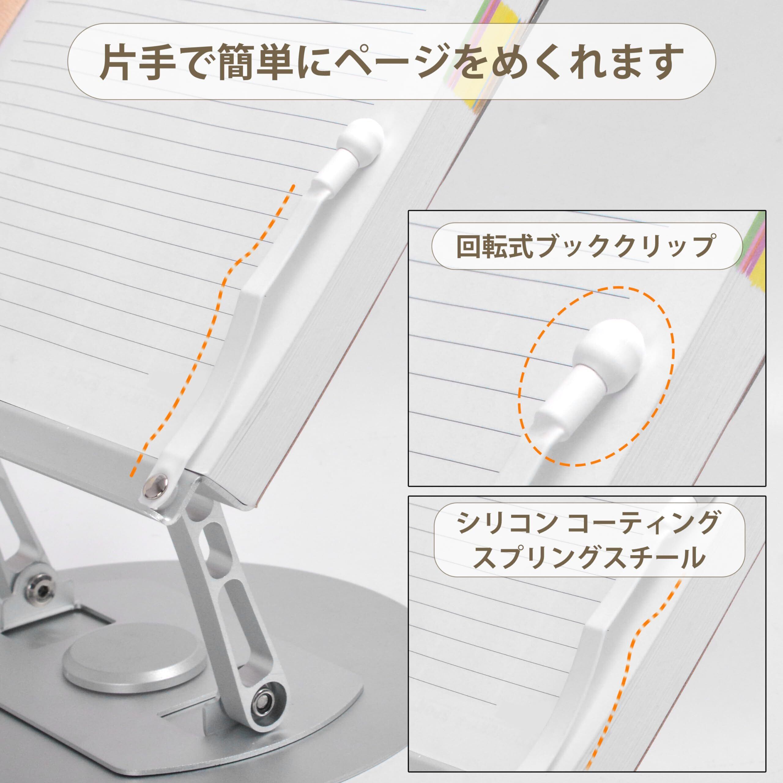 【高さ調整・360°回転】この書見台は組み立てる必要はありません。アルミニウム合金制で、滑らかで耐摩耗性があります。底はシリコンゴムの滑り止めが付き、安定性も良いです。180°の角度で無段階に調整でき、最適な角度と高さを固定して使用できます。 ベースは360°自由に回転できます。360°回転するブッククリップは文字を覆い隠しません。