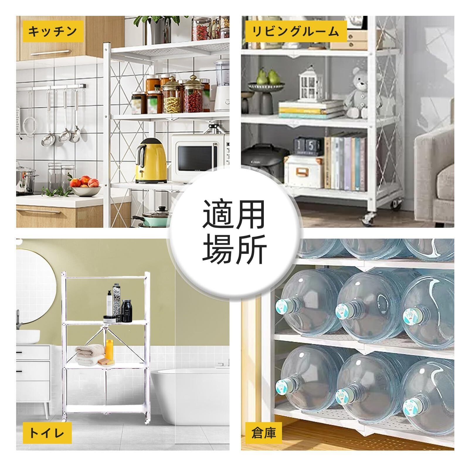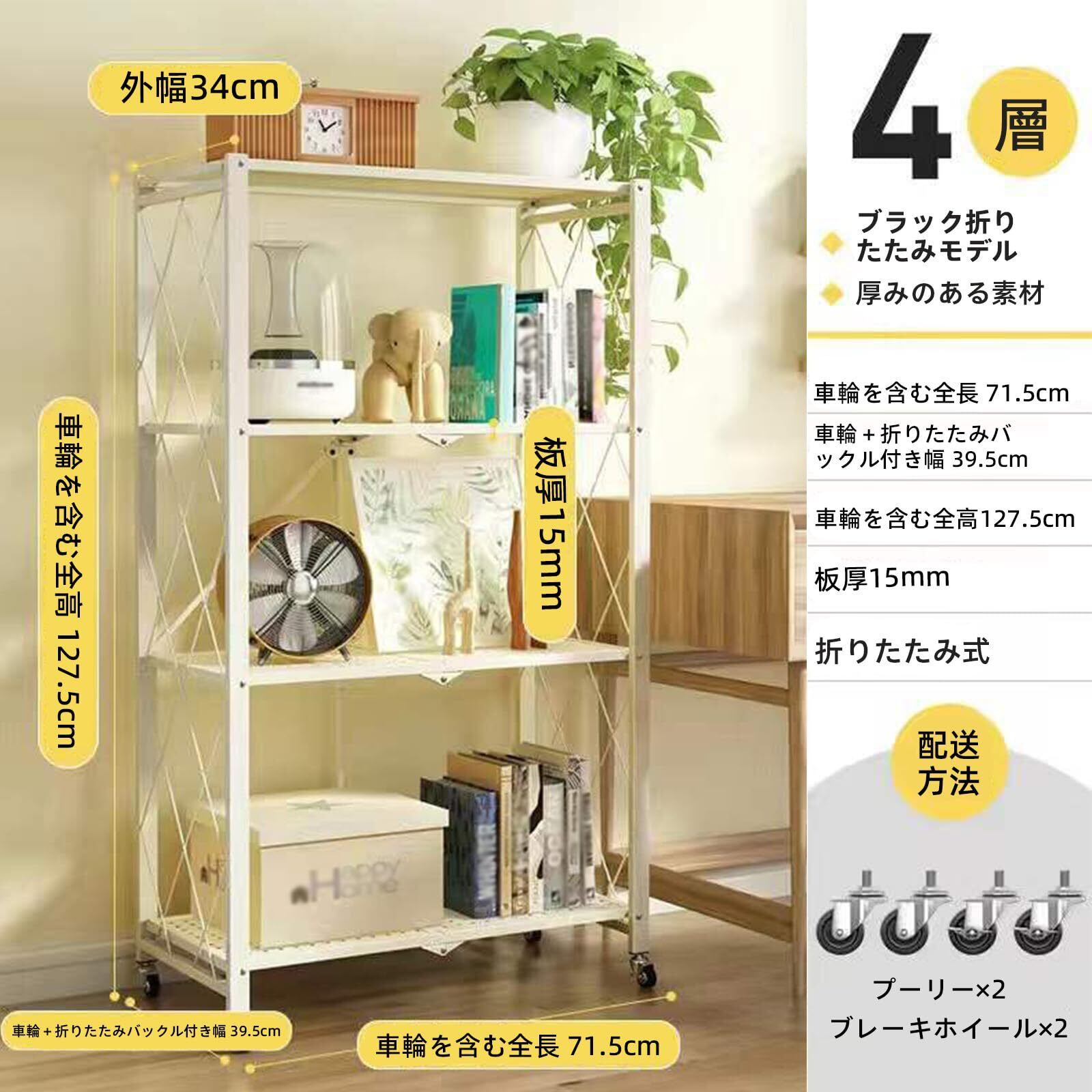 THCTYR 折りたたみラック 4段 スチール製【本体完成品/キャスターを付けるだけ】大容量収納 キャスター付き(ブレーキ機能) キッチン/ランドリールーム対応 オープンプラン棚 多用途ラック 薄型設計(白4層)