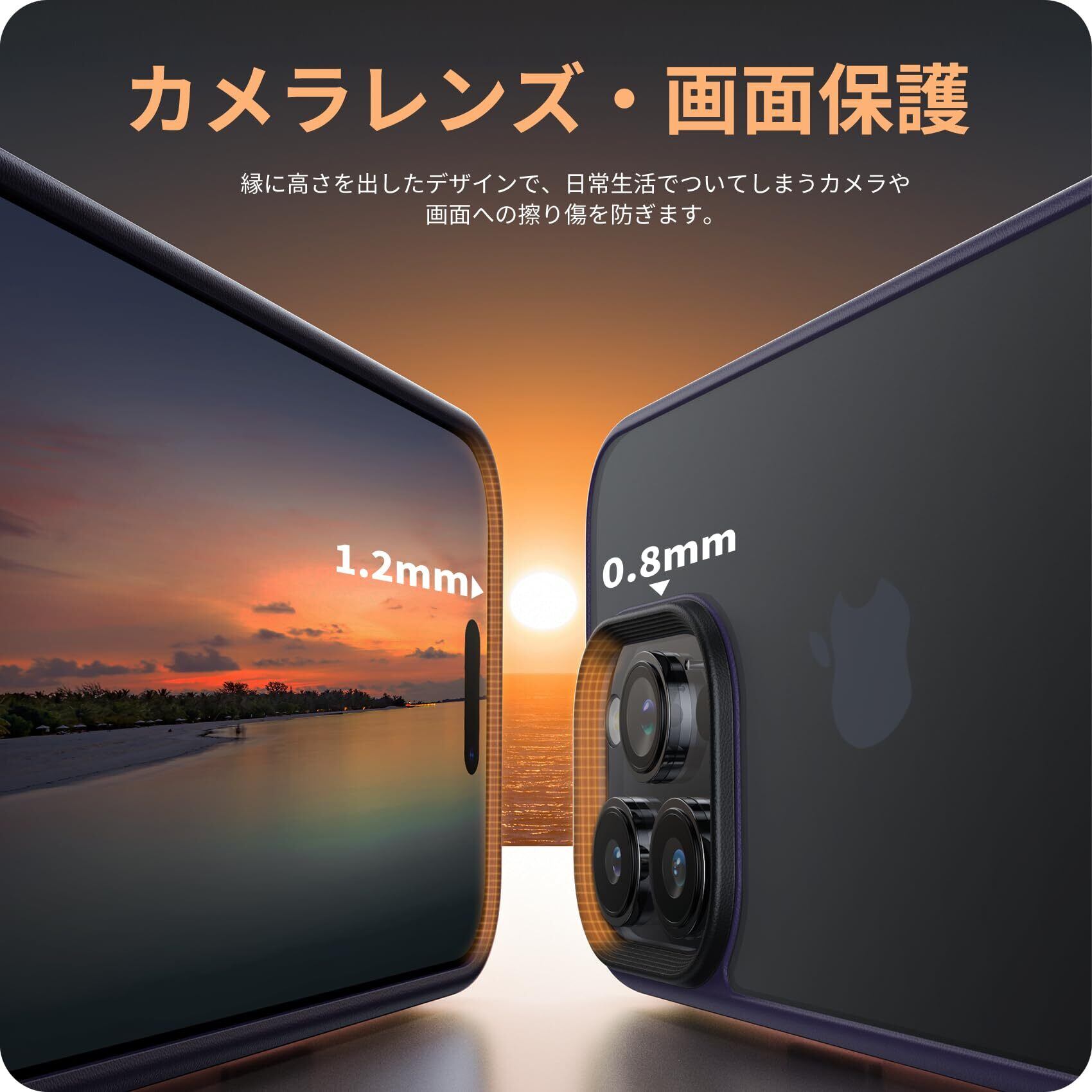 【細部までも保護・安心感】カバーの縁はスマホの画面より1.2mm高く、カメラレンズより0.8mm高い仕様です。併用の保護ガラスフィルムで平置きしても画面は接触しません。細部までの保護も配慮され、より一層な安心感を与えられます。