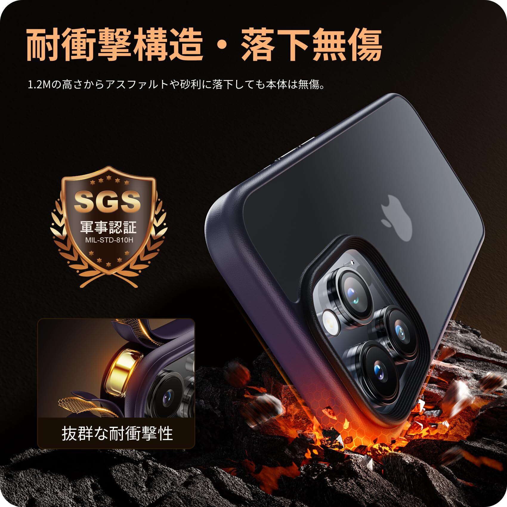 【米国MIL規格取得・耐衝撃】世界で有名な米国防総省が規定する米軍採用品規格「MIL-STD-810H」認証を取得済みです(認証番号:GZMR220802602301)。1.22mの高さからコンクリートの地面に厚さ5mmの合板を敷き、それぞれ違う角度から合計26回落下させても、本体は無傷です。高い耐衝撃性を誇り、スマホを全方位からしっかりと守ります。