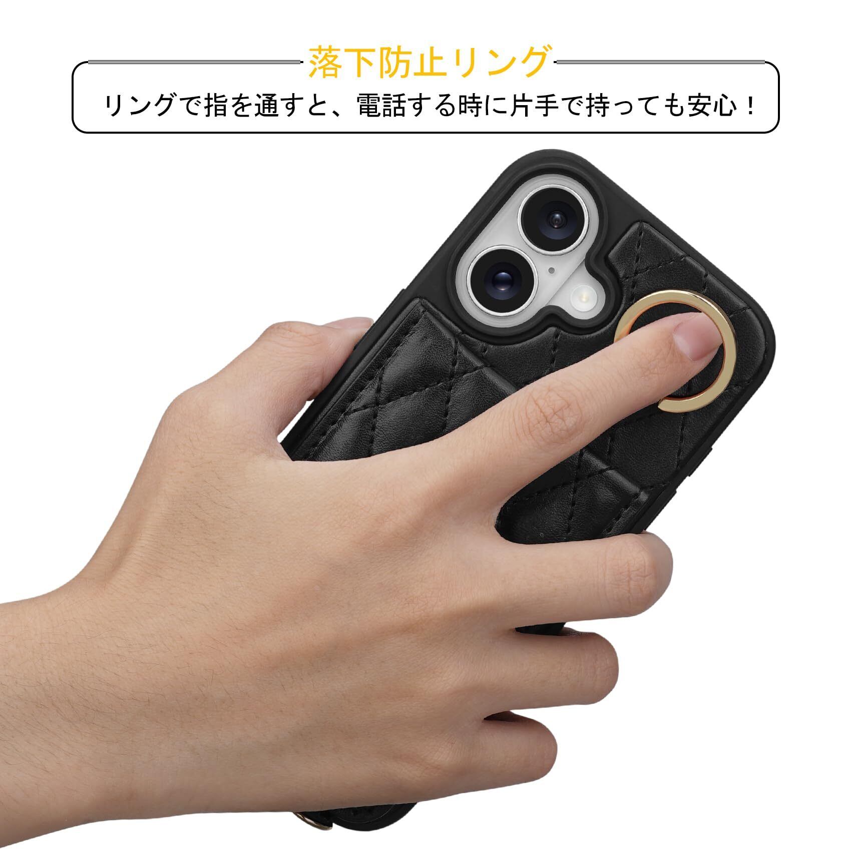 Shlybaay iPhone 16 Plus 対応 ケース 背面 手帳型 カードケース iPhone16 Plus 用 ショルダー ストラップ 背面ケース 手帳型ケース キルティング iPhone 16 Plus アイホン 16 プラス 用 スタンド 肩掛け カード収納 斜め掛け 首掛け PUレザー マグネット 可愛い チェック柄 格子柄 女性 菱形 おしゃれ 6.7inch ブラック