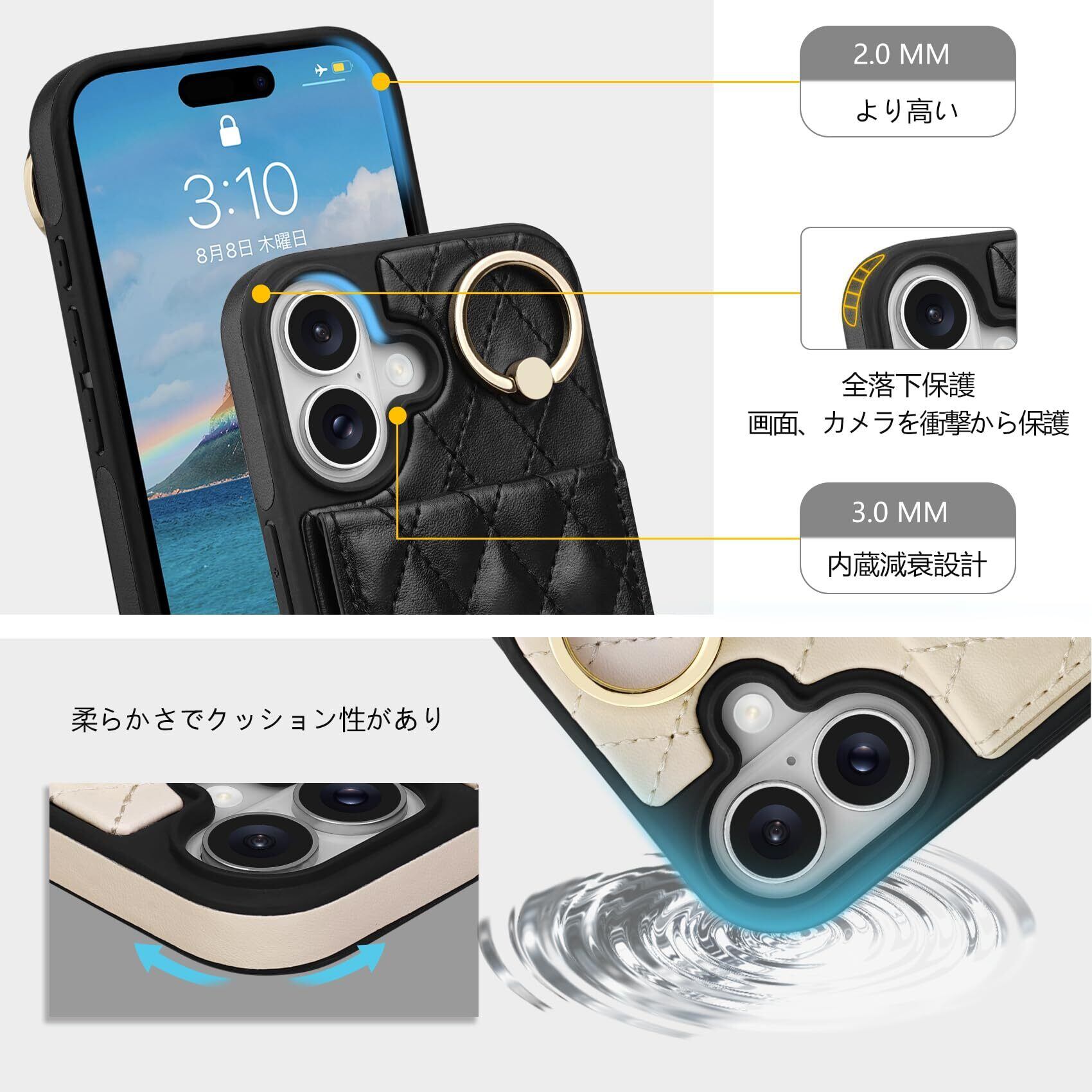 【安心感満載】調節可能なショルダーストラップ用の2つのホールとリングを備えており、お好みの長さに調節できます。ストラップは落下や紛失防止に役立ち、胸元に掛けることで両手を自由にお使いいただけます。リングを指に通すことで、ストラップなしでも落下を防止可能です。さらに、カメラ部分は高めに設計されており、レンズをしっかり保護いたします。