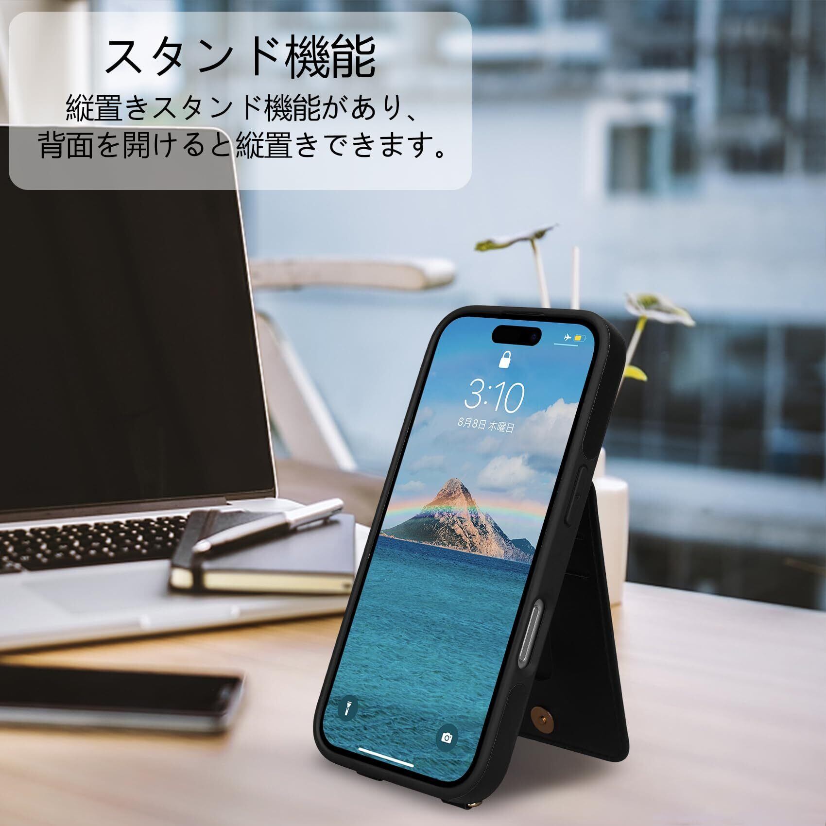 【多機能】❶ 収納機能:背面に4つのカードポケットがあり、カード、名刺、定期券、免許証、写真などを整理して持ち運べます。マグネット式開閉で、収納物が落ちる心配もありません。シンプルで便利な縦型開閉デザインが特徴です。❷ スタンド機能:縦置きスタンド機能があり、背面を開けるとビデオ通話や動画再生、レシピ閲覧などのハンズフリー操作が可能です。