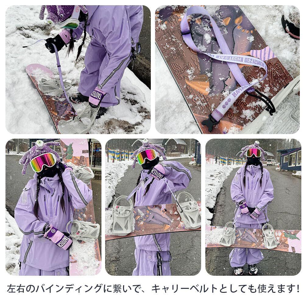 【こんな使い方も便利】左右のバインディングに繋いで、キャリーベルトにすれば、移動時にボードをさっと背負えるのが便利です!