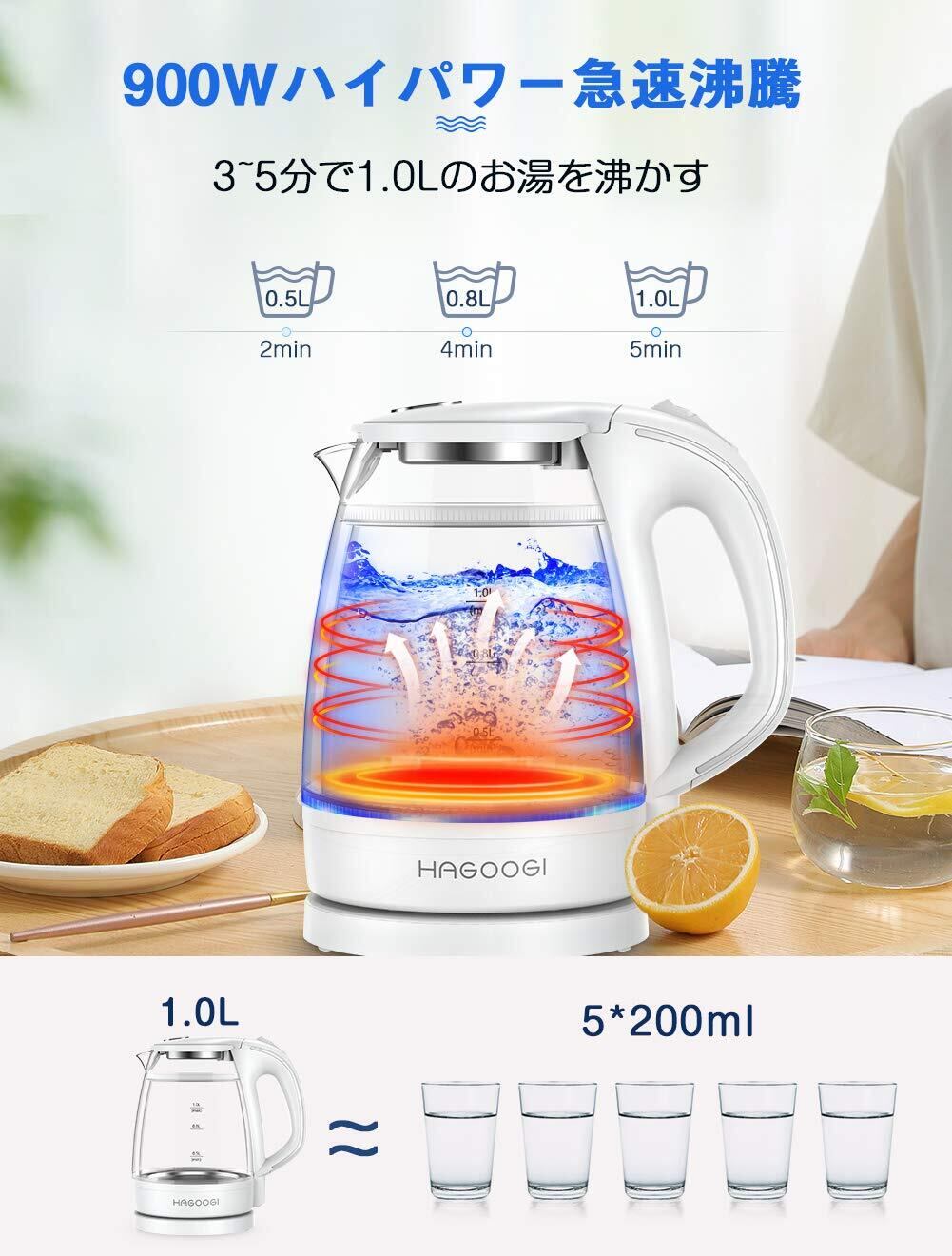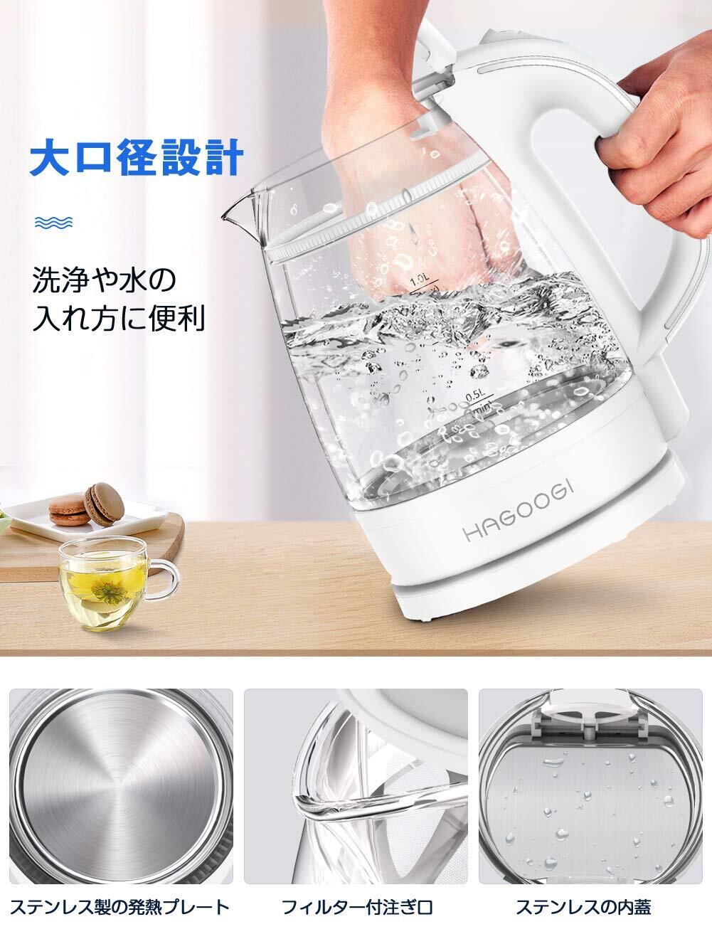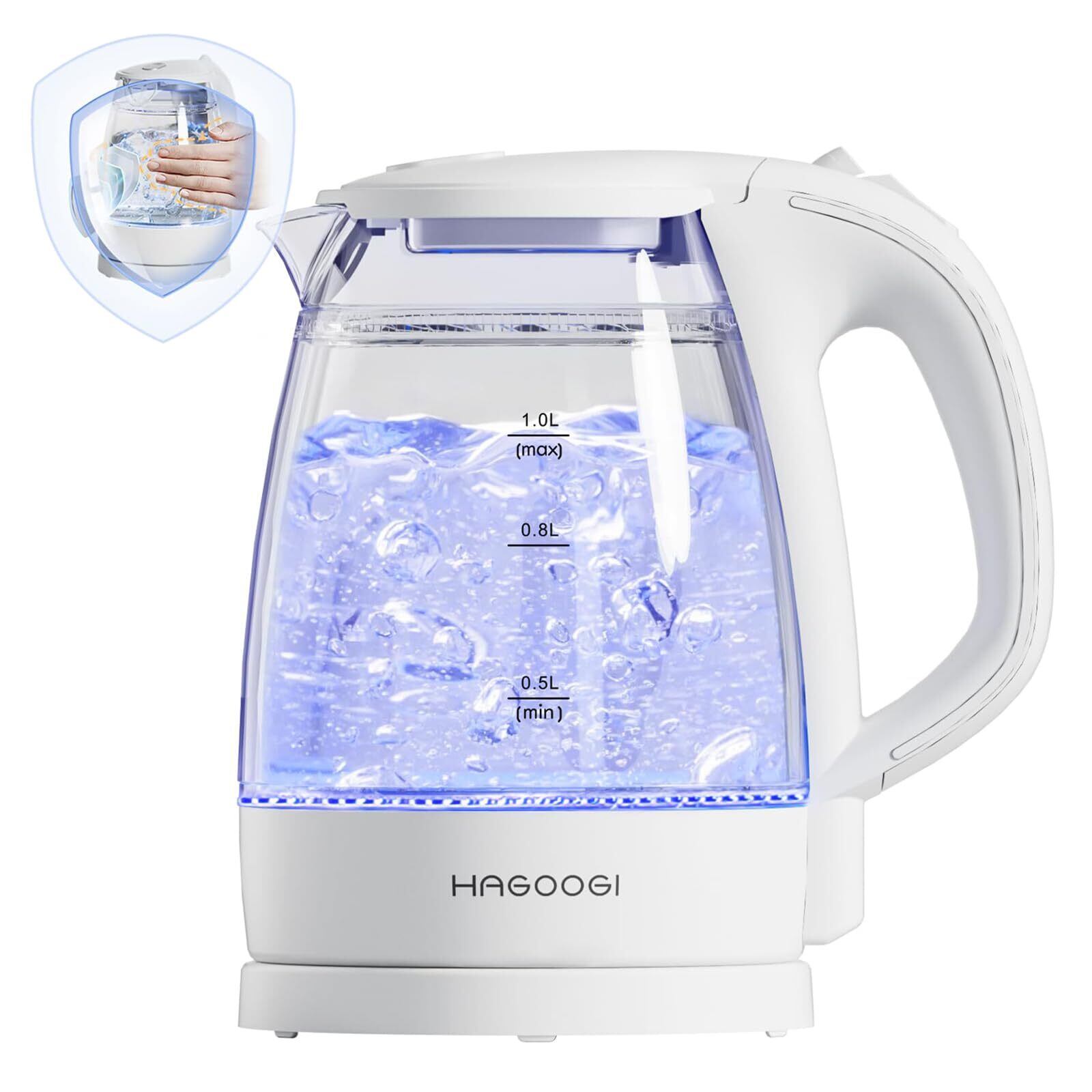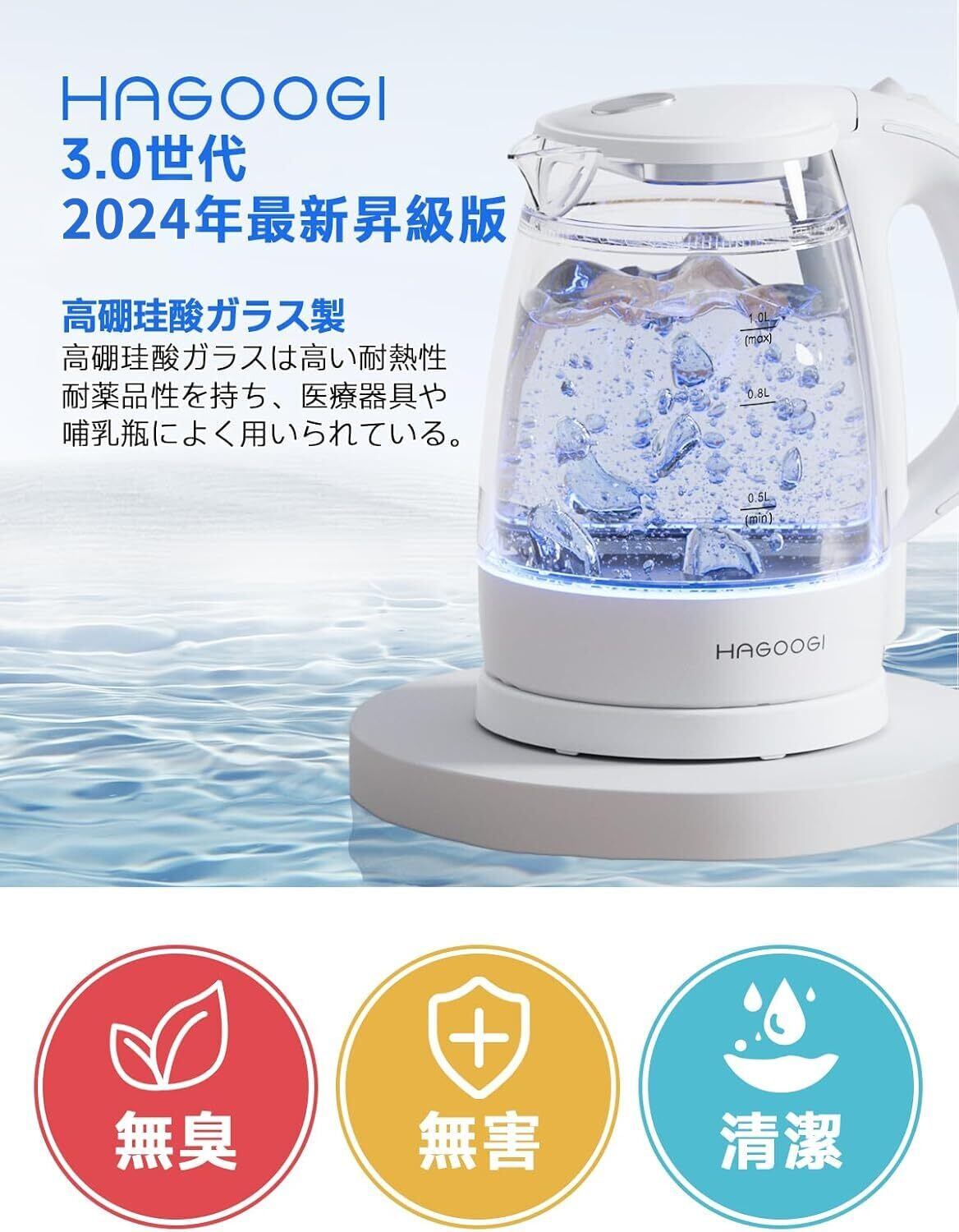 【無臭&二重構造・火傷防止】ハゴオギ 電気ケトル ガラス 1L ケトル 電気 二重構造 火傷防止【2024年最新昇級版】 「本体青く光る」湯沸かし器 透明 おしゃれ 耐熱ガラス ポット 手軽な 湯沸かしポット 沸騰自動OFF/空焚き防止機能 PSE認証済 プラスチック臭に敏感な人に最適 コーヒー 紅茶 お茶 ホワイト