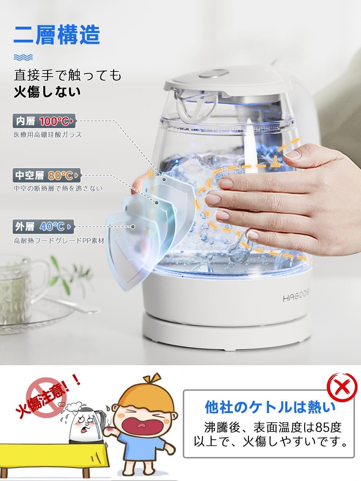【二重構造ガラスケトル・安全性アップ!】HAGOOGI電気ケトルは、従来の単層ガラスケトルとは異なり、本体には二重構造が採用されています。内層には耐熱性が高いホウケイ酸ガラスが使用され、外層には軽量の耐熱食品グレードのPP素材が使用されています。沸騰しているときでも、外層の温度はほんのり暖かい程度で、子供やペットのいるご家庭でも、うっかり触れてしまって火傷する心配はありません。また、ケトル本体が二層ガラスではないため、女性やお年寄りの方でも持ちやすい重さとなります。さらに、外層は柔軟性のあるPP素材で作られており、落下しても割れにくく、割れた場合でも内層のガラスの破片が飛び散らないので、安全性を大幅アップ!