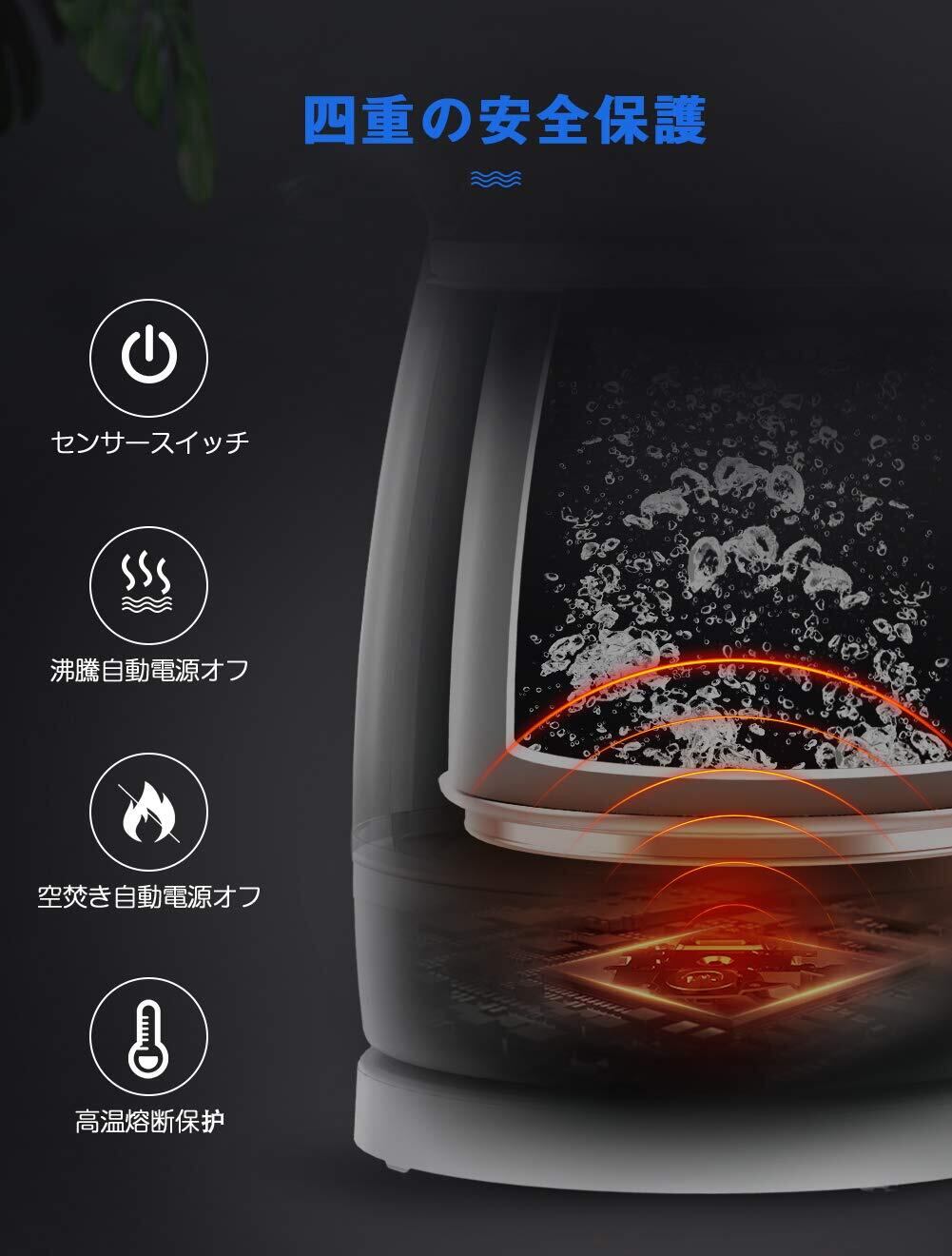 【安心安全の四重保護を備えたケトル】HAGOOGIガラスケトルは、高品質な水温センサーを搭載しており、正確な温度検知、沸騰後の自動電源オフ、過熱保護、空焚き防止という四重保護機能が搭載しております。電源の切り忘れにより事故が発生することにご心配なく、見守らなくても安心です。更に、高精度な水温検知により、水を徹底的に煮沸でき、中の一部の有害物質を取り除きます。