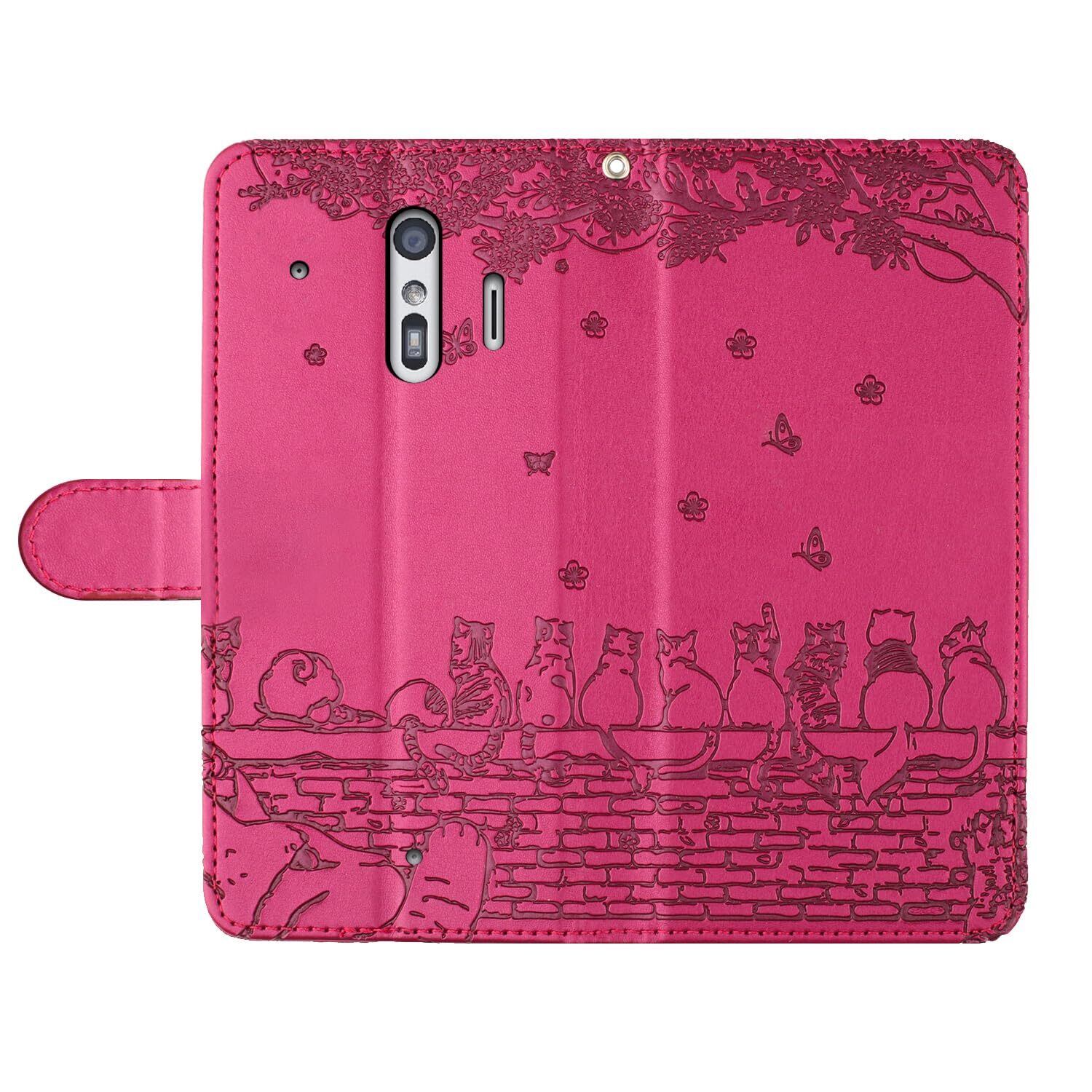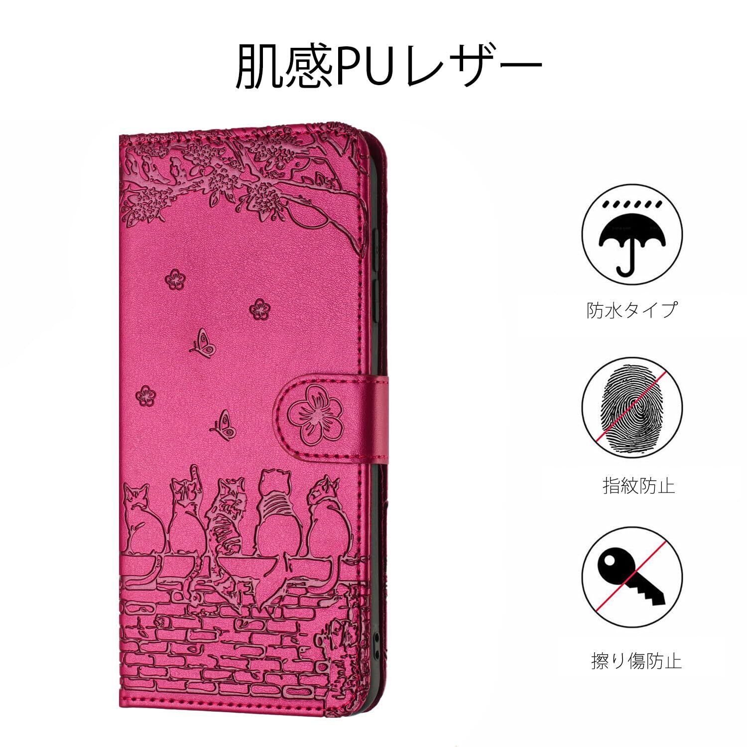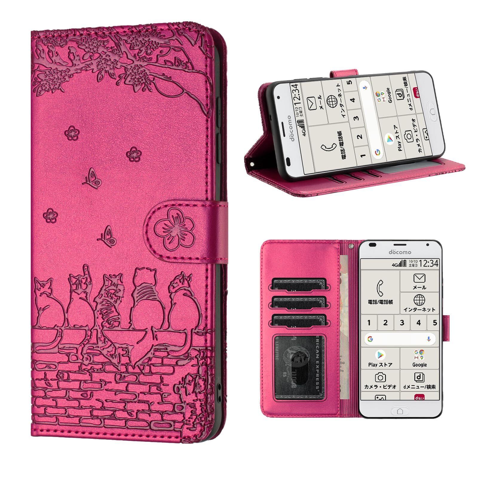らくらくスマートフォン F-42A / らくらくスマートフォン me F-01L ケース 手帳型 人気 f42a f01l f-01l ケース 手帳型 かわいい猫と美しい桜柄 f-42a ケース 手帳型 PUレザー 本革 f42aスマホケース 耐衝撃 Fujitsu 富士通 らくらくホン f01l ケース 手帳型 スマホケース カバー カード収納 マグネット式 スタンド機能 軽量(ローズレッド)