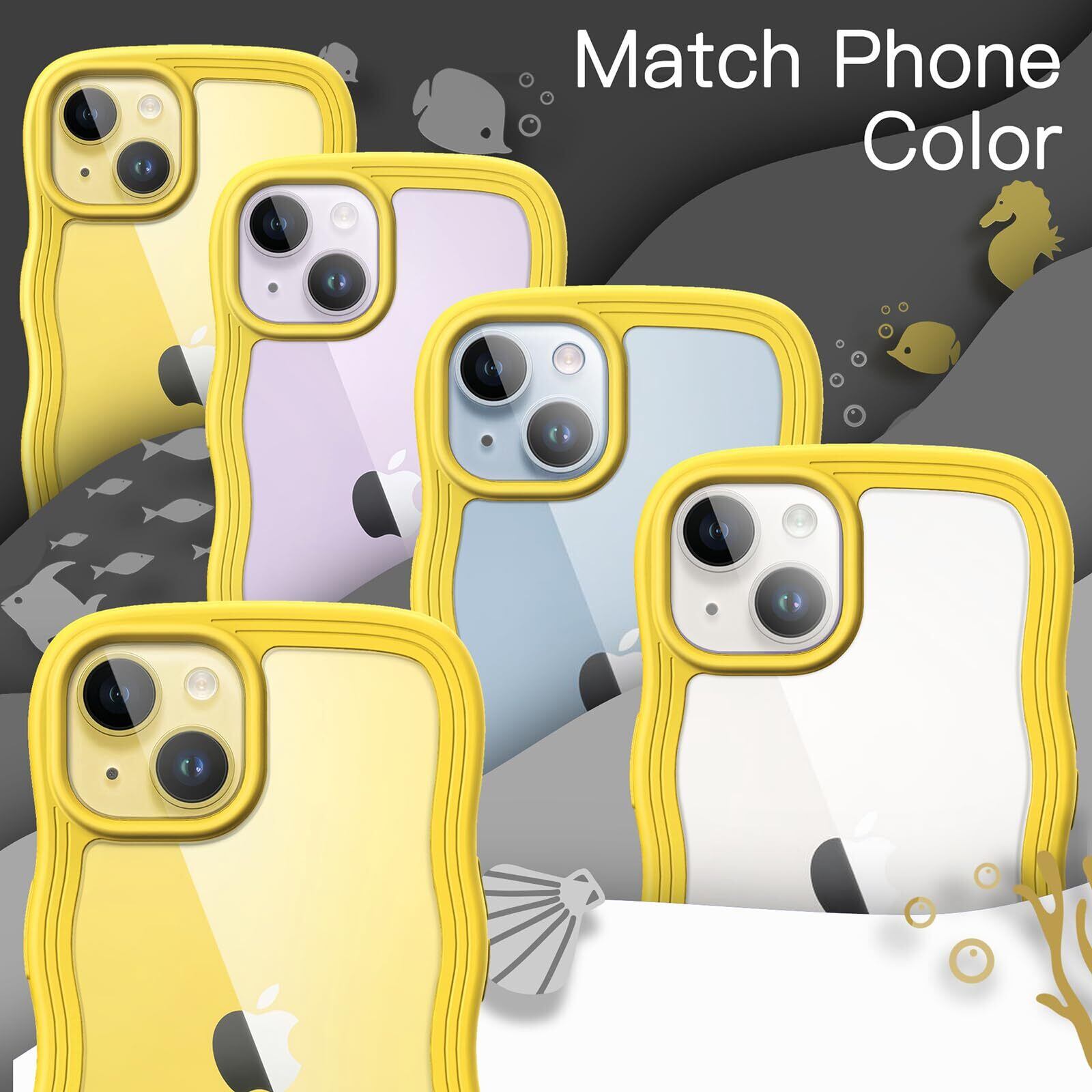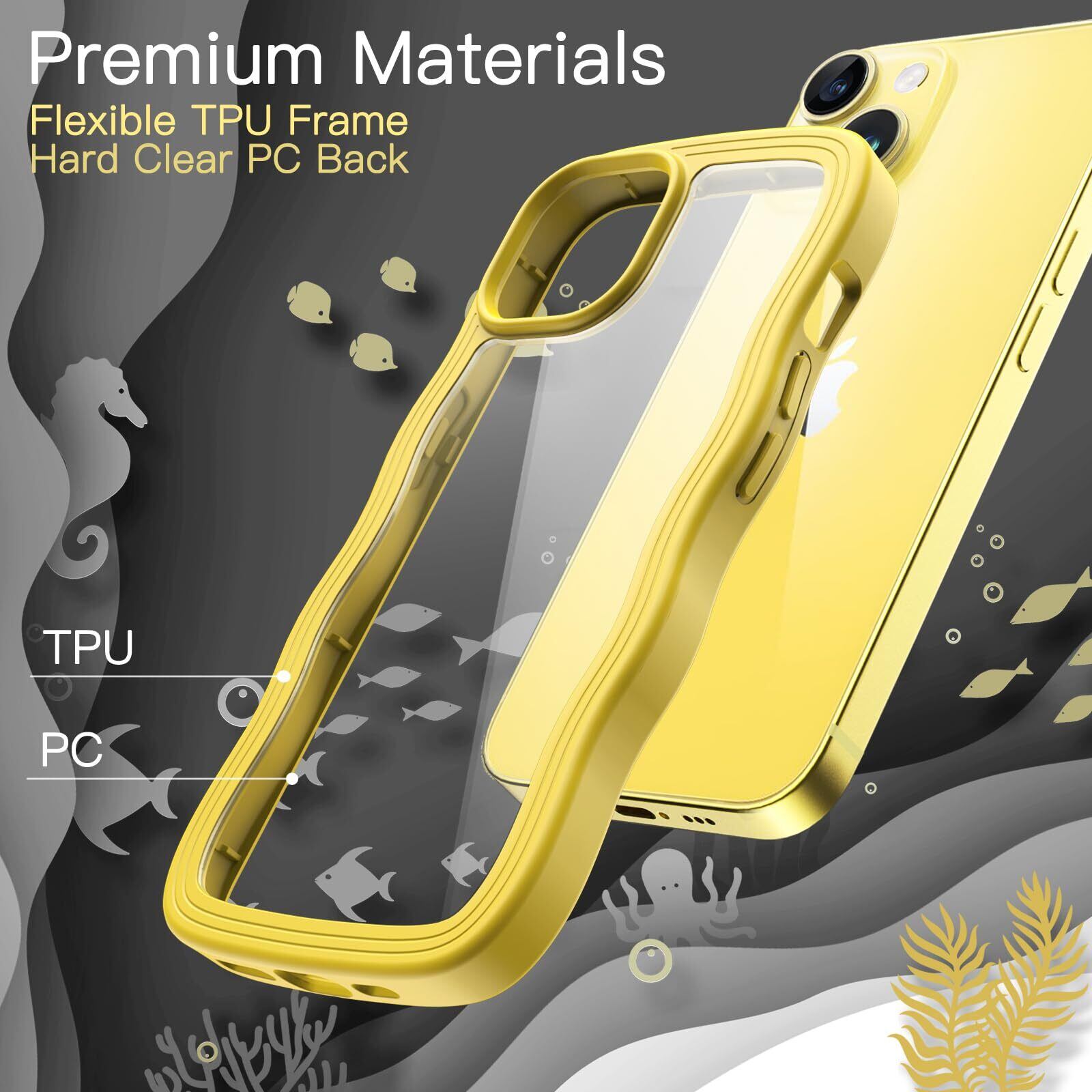 JEDirect iPhone 14 6.1インチ用 かわいい ケース 波状フレーム うねうね 耐衝撃 スマホカバー 女性用 女子向け クリア ハードPCバック (イエロー)