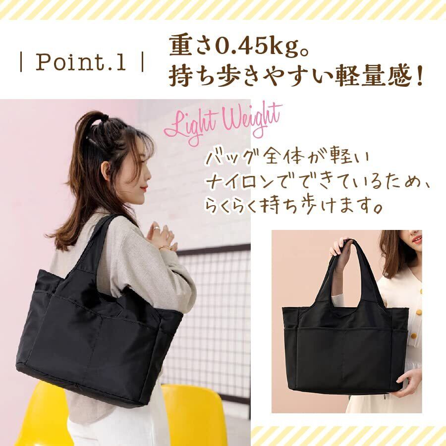 当商品は通勤でもプライベートでも使える、大容量のトートバッグです。 見た目は飾らないシンプルなビジュアルとなっており、どんなファッションにも違和感なくなじみます。 【重さ0.45kg。持ち歩きやすい軽量感】 ナイロン生地でできており、重さはなんと0.45kg。 1kgにも満たない重さだから、ストレスフリーで持ち運べます。 ナイロン素材は柔らかいので、使用しないときには折りたたむことも可能ですよ。