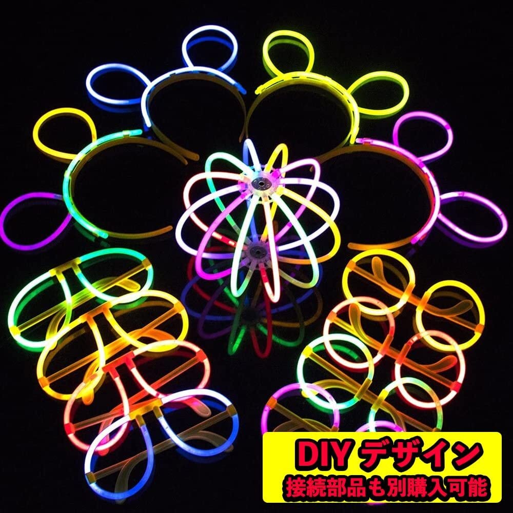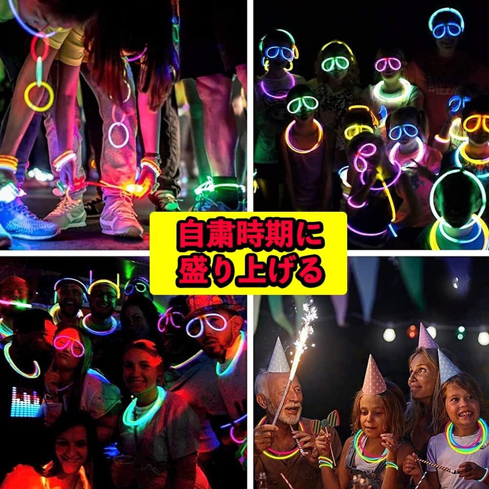 【適用場合】: 毎年夏祭りやイベントに大人気の「光るブレスレット」が祭りはもちろん、文化祭・子ども会・誕生日パーティー・キャンプ・ライブ・フェスティバル・縁日・イベントのグループ分け・忘年会など様々なシーンで大活躍しています。 ブレスレットとしてはもちろん、まっすぐのまま使ってペンライト風や、沢山つなげてネックレスにするのもよし。 腕、足につけてもよし!夜の散歩に迷子防止としてもおすすめします。使い方、楽しみ方は無限大です!男女兼用 棒をパキット折れるだけで液体が混ぜ、暗い中でもたちまち美しい蛍光に明るく光るケミカルライトです。