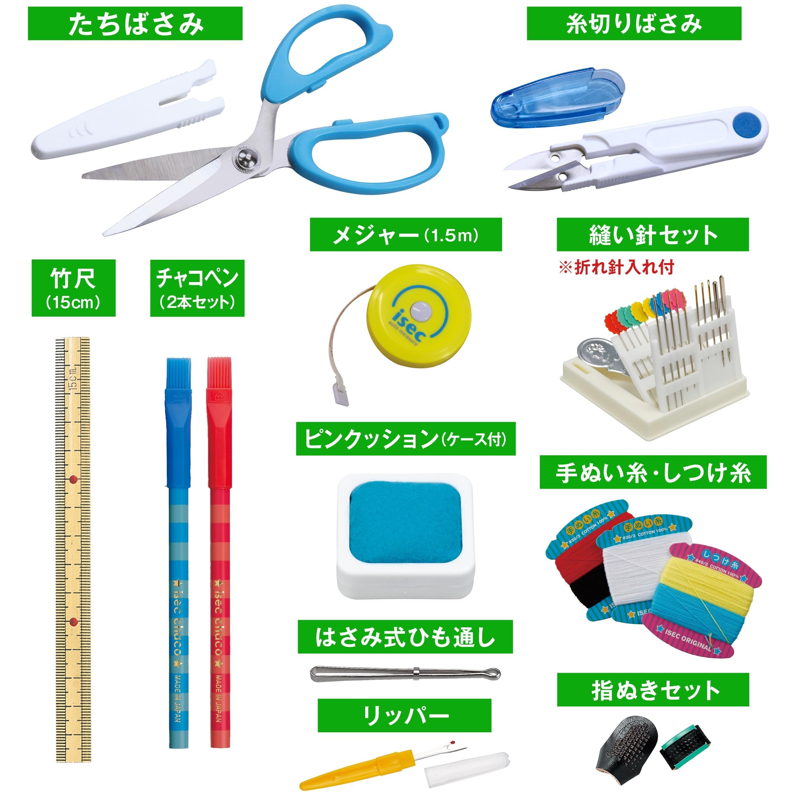 ケース(トレイ付), たちばさみ(左右兼用), 糸切りばさみ, 指ぬきセット, 自動巻メジャー(1m50cm), はさみ式ひも通し,… 表示を増やす