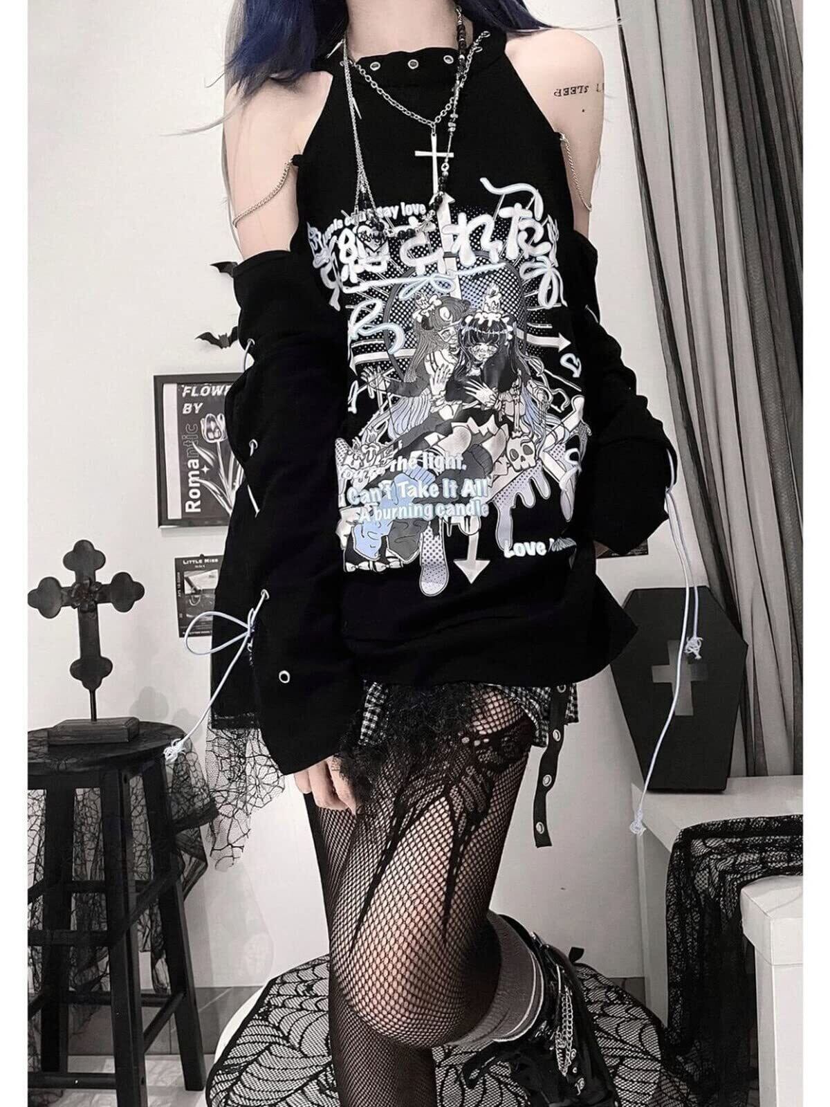【新登場】:これからの季節に大活躍する肩出し半袖Tシャツは新登場です。 病みかわいいサブカル系スタイルです。