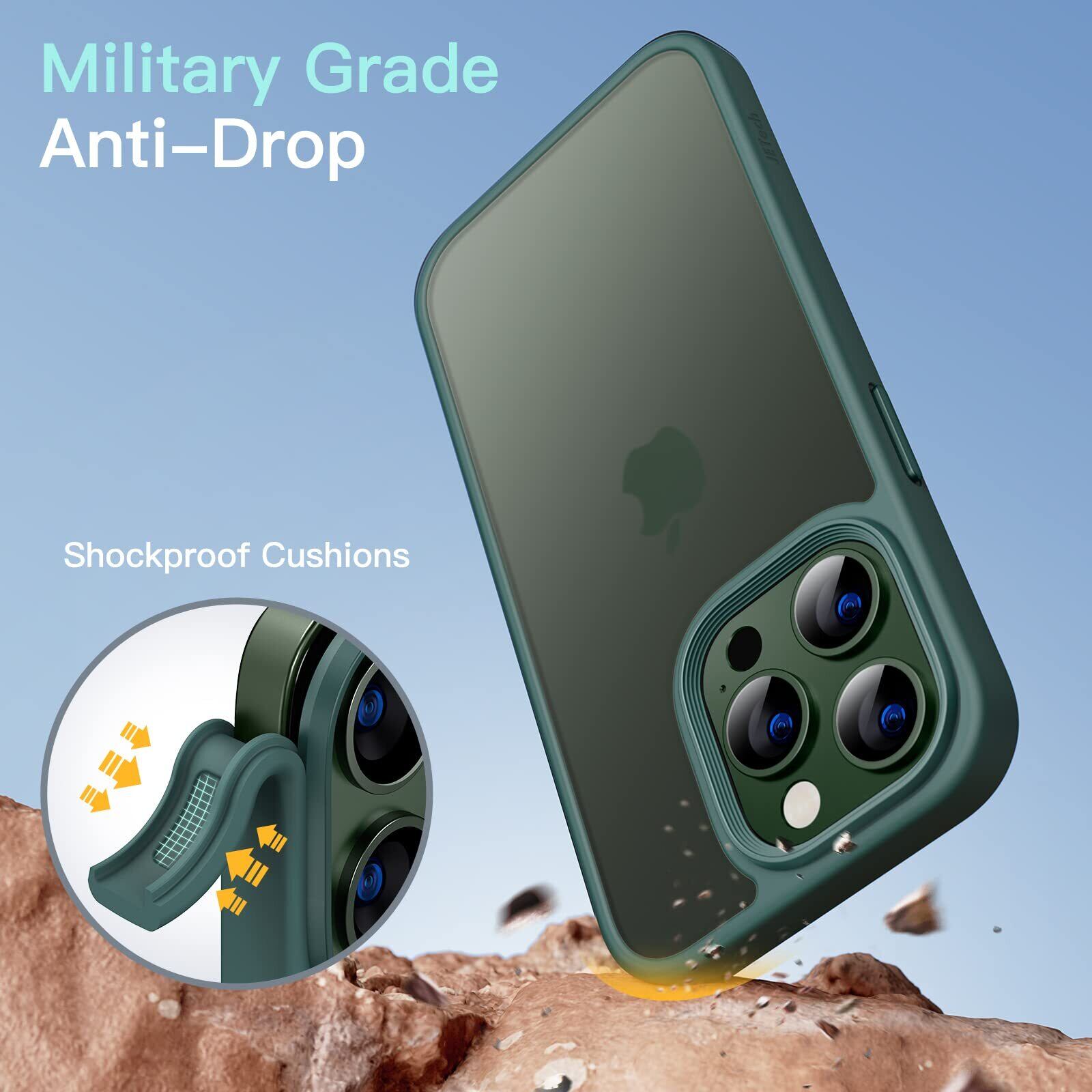 JEDirect マットケース iPhone 13 Pro 6.1インチ 耐衝撃性ミリタリーグレードの落下防止 つや消しの半透明の背面電話カバー 指紋防止 (濃い緑色)